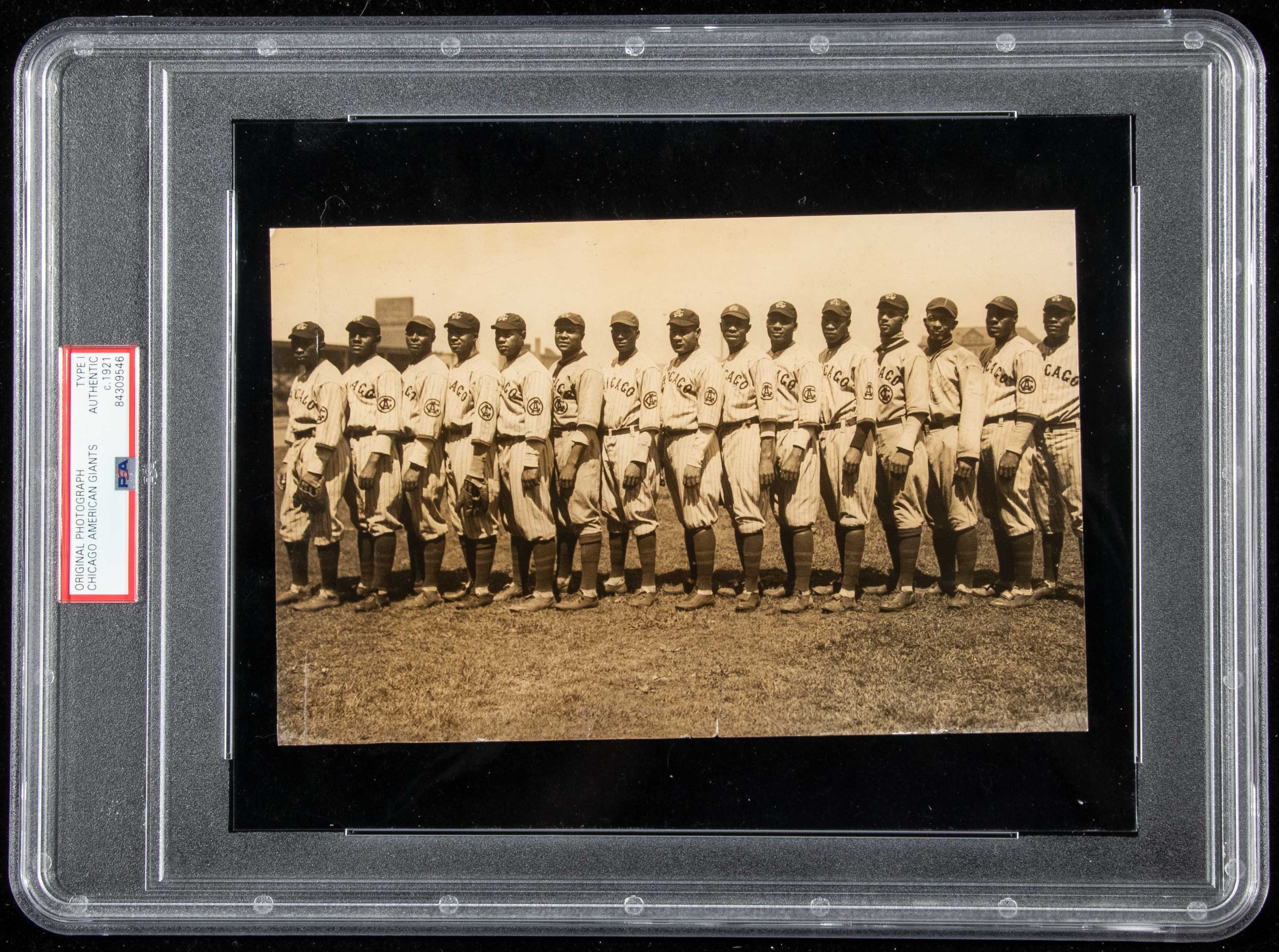 Description:Rare Chicago American Giants photograph with Christobal Torriente (c.1921 (PSA/DNA "Type I"). Striking sepia tone 5.5"x8.5" photograph showing uniformed team members standing shoulder to shoulder. Most notable among the group is Hall of Famer Christobal Torriente (8th from the left) who had long played in the Cuban League and joined the Chicago American Giants in 1919. He helped the team to pennants in 1920, 1921, and 1922 cementing their place as one of the most formidable of the period. Others shown are believed to be John Reese, Otis Starks, Bobby Williams, Jelly Gardner, George Dixon, Jimmie Lyons, Dave Malarcher, Jack Marshall, Jim Brown, Bingo DeMoss, Tom Williams, Dave Brown, Leroy Grant and Tom Johnson. Displays beautifully with some modest wear including a few wrinkles and one heavier crease running down the left edge. Small tear along the bottom is hardly visible when viewing from the front. Mounting residue on back. Authenticated and encapsulated by PSA/DNA ("Type I"): Technical GD with far superior display value