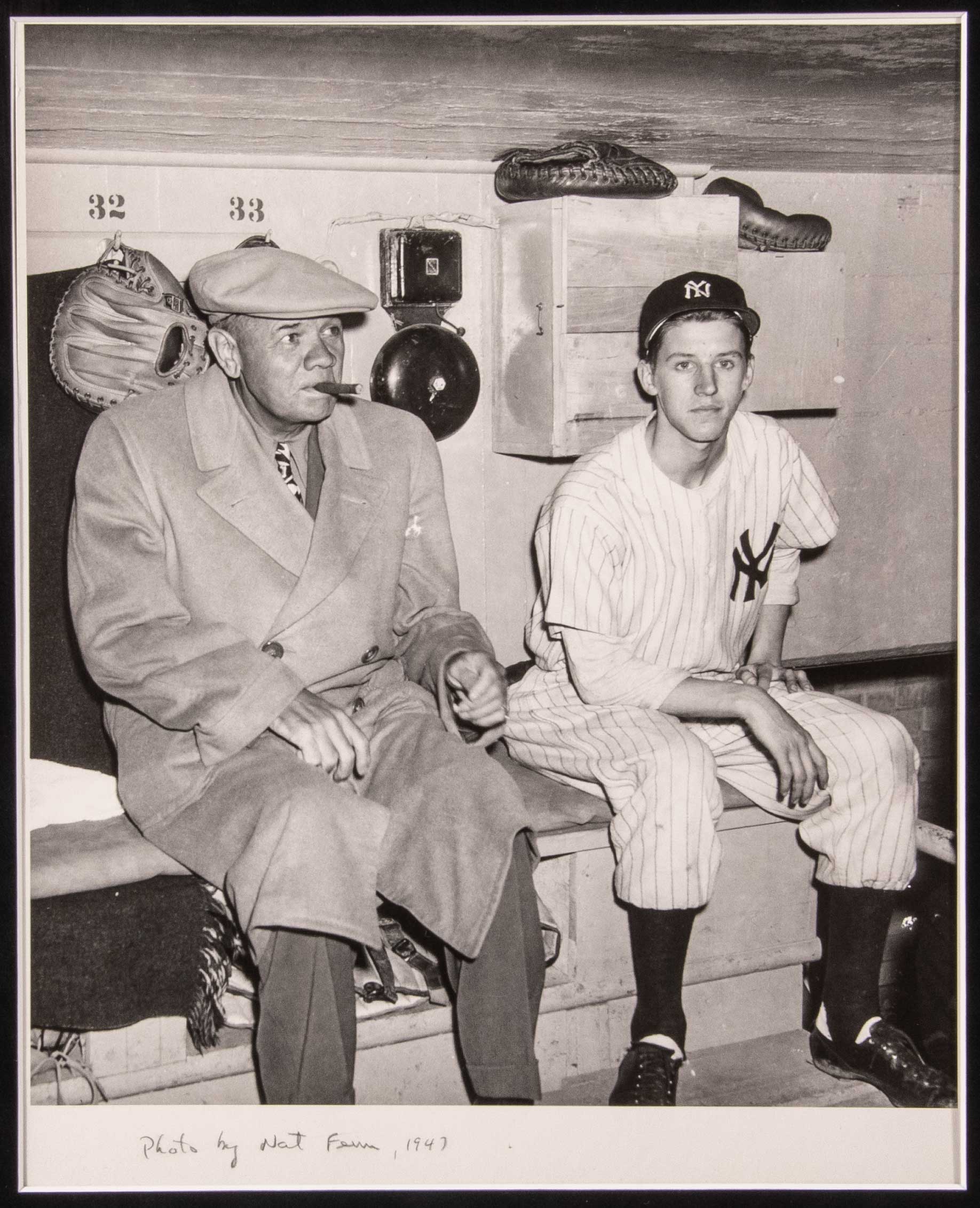 Description:Babe Ruth Large Format photograph by Nat Fein c.1947. Large format original image taken by noted New York Herald and Pulitzer Prize winning photographer Nat Fein. Photo presents in a matte finish picturing Babe Ruth seated in the dugout with the New York Yankees batboy on April 27, 1947. Clarity is very fine with Ruth clearly displaying the effects of throat cancer while ironically smoking a cigar. Signed in pencil by Fein at lower margin. Matted and framed: EX