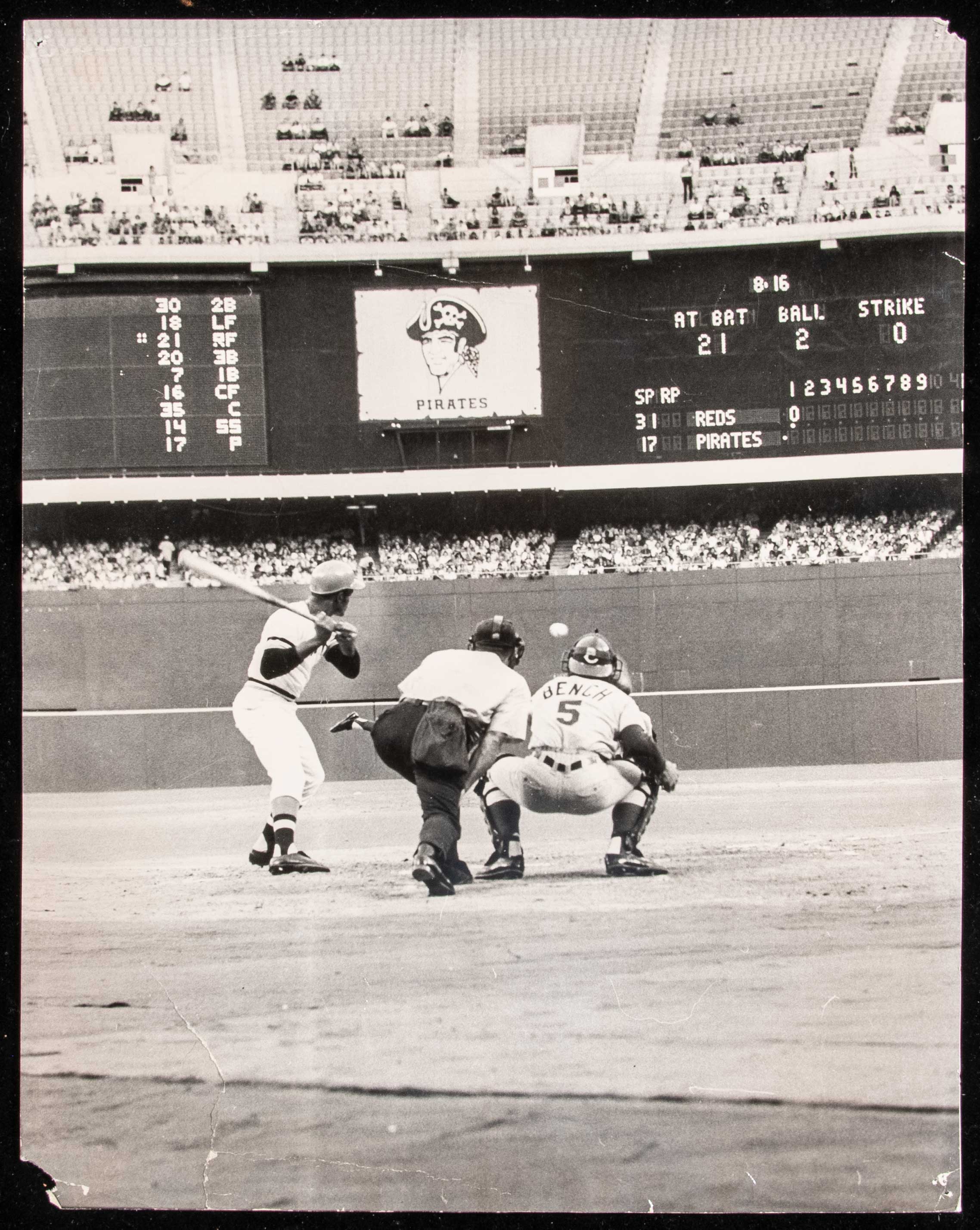 Description:Roberto Clemente and Johnny Bench large format photograph c.1970s (PSA/DNA "Type I"). Sepia tone 11"x14" photograph showing Roberto Clemente at bat in Three Rivers Stadium with Johnny Bench at the catcher position. A choice image capturing two of the most celebrated players of the era in game action and seldom seen in this large and displayable size. Scattered wear includes creasing, wrinkles, a tear to lower left, and tack holes at corners. Much of this damage could be matted out however the larger flaws will remain visible. Includes LOA from PSA ("Type I"): FR/GD-GD