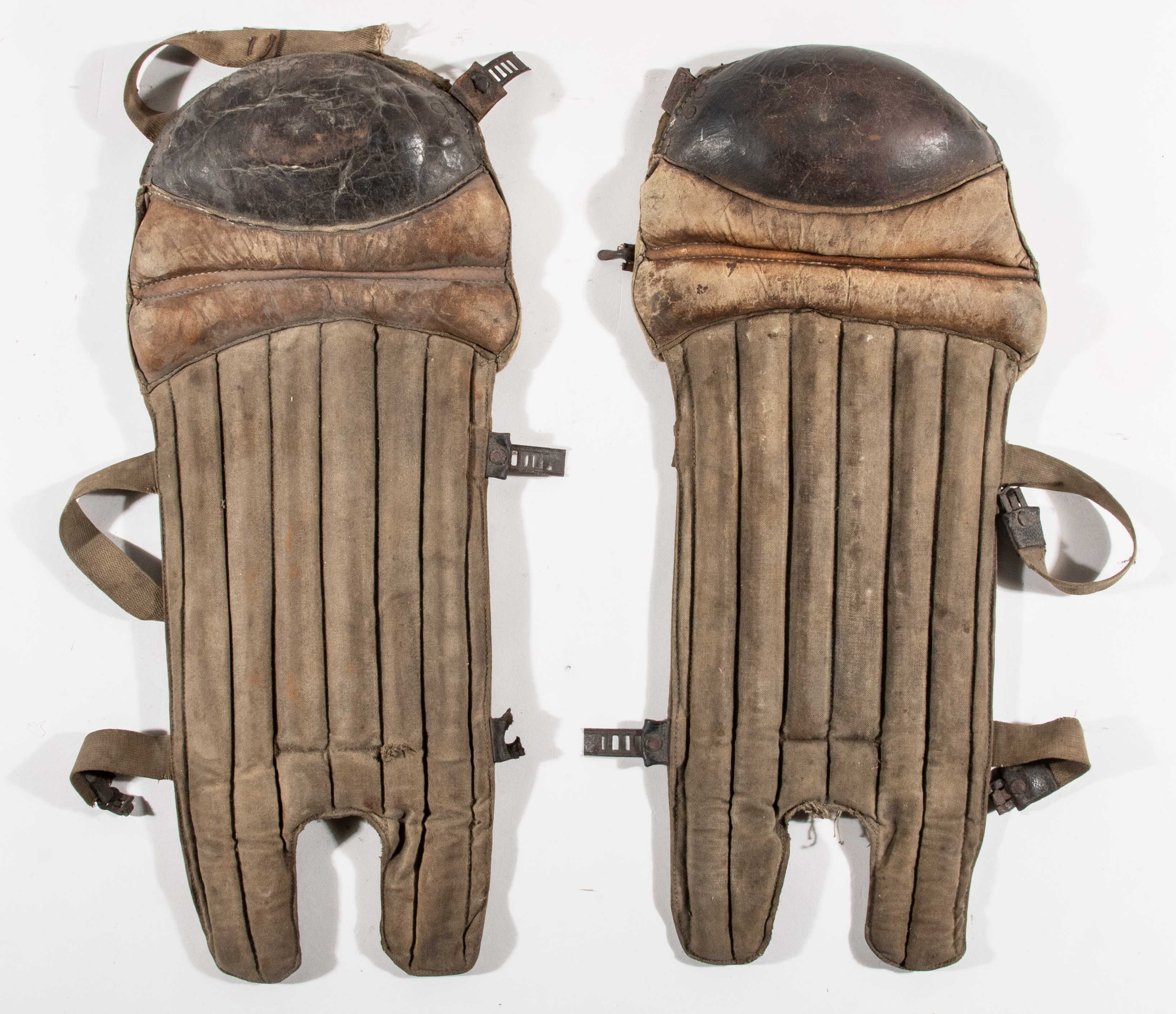 Pair of unusual vintage baseball reeded shin guards c.1910s-20s (VG). Constructed of heavy fiber interior covered with canvas exterior, leather padding above, and molded knee-cap. Used, with broken straps: VG