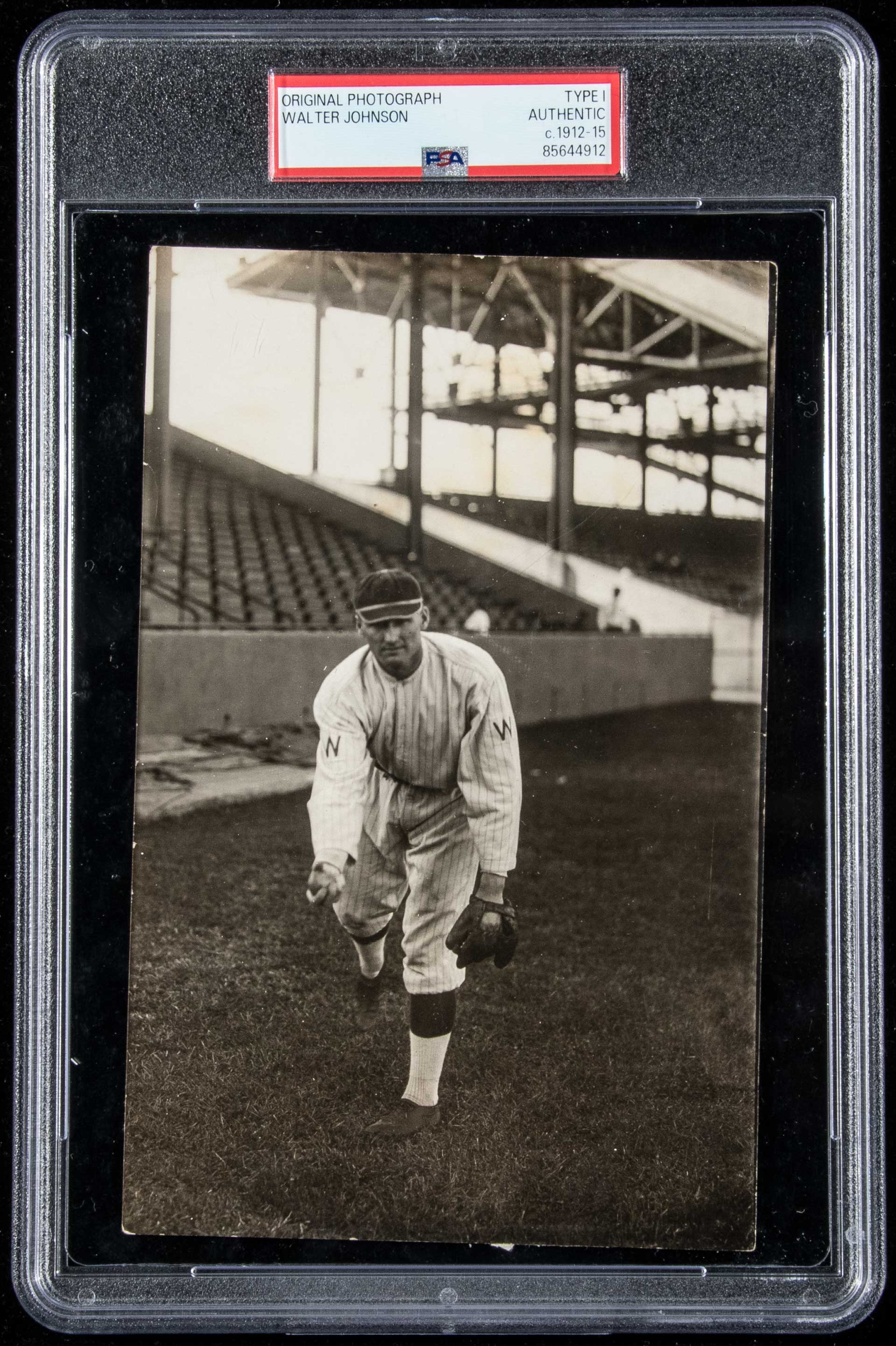 Description:Walter Johnson photograph c.1912-15 (PSA/DNA "Type I"). Sepia tone 4.75"x7.5" photograph showing Johnson early in his career with the Washington Senators. Light toning and some mild scattered wear including mounting residue on the back. Authenticated and encapsulated by PSA/DNA ("Type I"): GD/VG