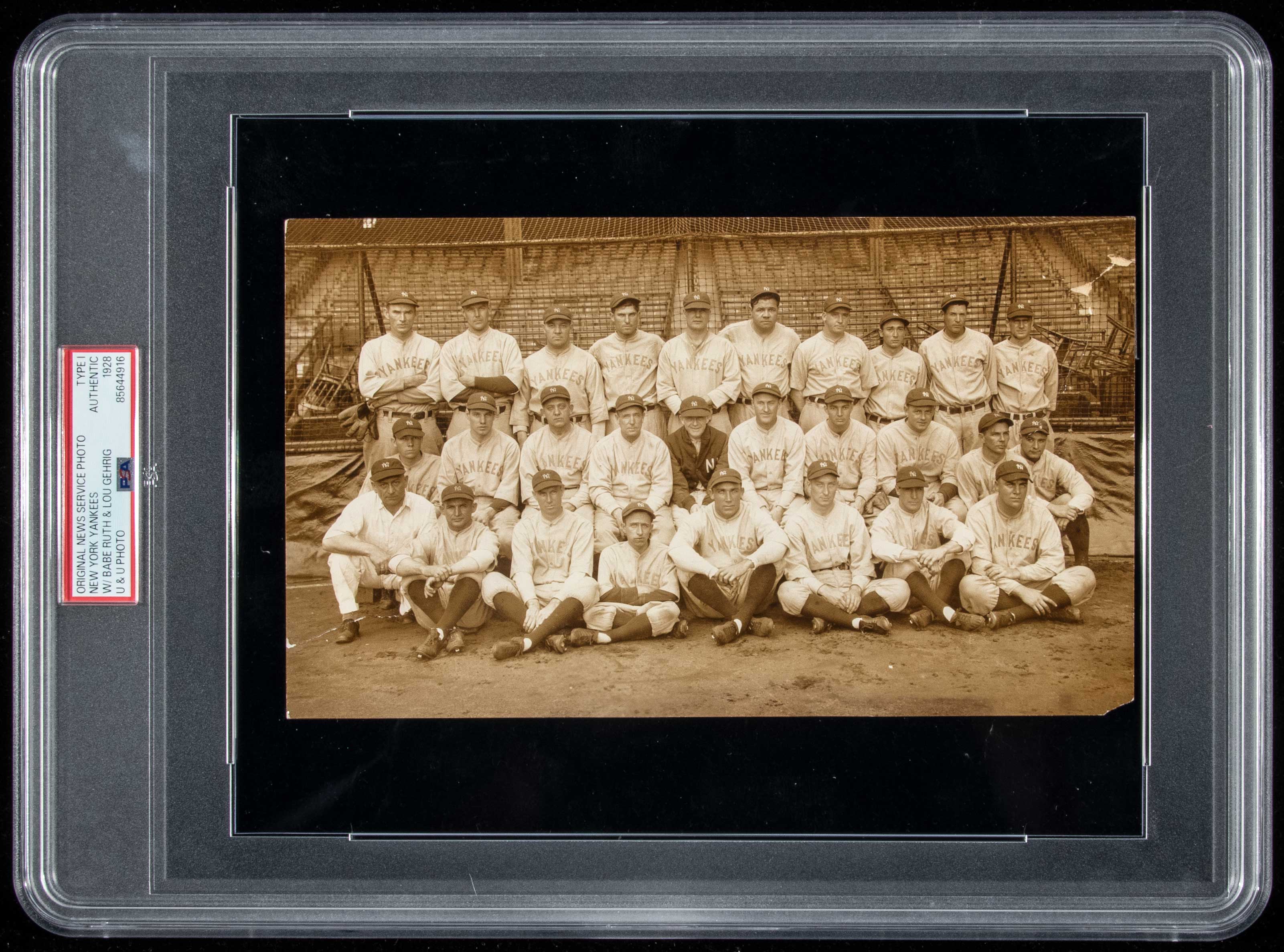 Description:1928 New York Yankees team photograph taken just before the World Series (PSA/DNA "Type I"). Choice 5.25"x9" photograph showing members of the 1928 World Series Championship team just prior to the start of the World Series. Mild toning with scattered wear including a crease to lower left, another at upper right (with a few flecks of upper surface paper loss), and there is a chip to lower right corner. Original paper caption on back. Authenticated and encapsulated by PSA/DNA ("Type I"): GD