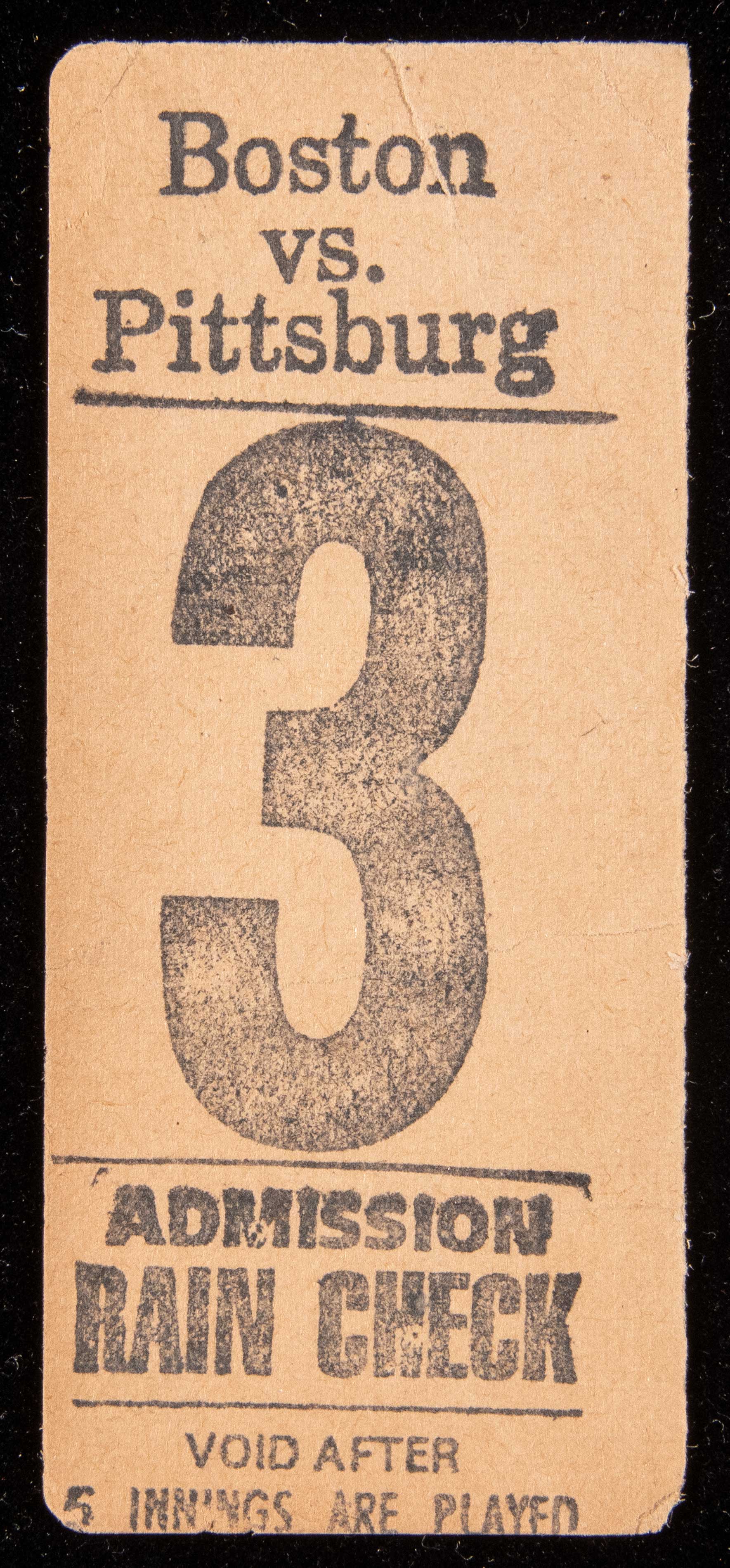 Description:Extremely rare 1903 World Series Game Three ticket stub: Newly discovered example from the Inaugural World Series Original heavy stock stub issued for the game played in Boston at the Huntington Avenue Baseball Grounds. Pittsburgh emerged the winner with the Pirates workhorse Deacon Phillippe pitching on only one day of rest leading his team to a 4 to 2 victory. The ticket stub denotes the two participant teams at top with game number three indicated beneath along with rain check information. The small population of inaugural World Series tickets, both Boston and Pittsburgh, are particularly susceptible to condition issues given their original fragility and environment of use. This example remains in fine overall condition with a few minute/minor wrinkles (some bordering on creases) and a touch to corners. Along with its mate within this auction the offered ticket was recently discovered within the estate of an advanced hobbyist who assembled their collection over a number of decades. One of only a scant few exemplars to be offered publicly as issued for the first World Series and a Holy Grail among collectors of all baseball related tickets. Includes a report from Frank Romano (Professor Emeritus, Rochester Institute of Technology & President, Museum of Printing) confirming that the paper stock and print are correct for the period: VG