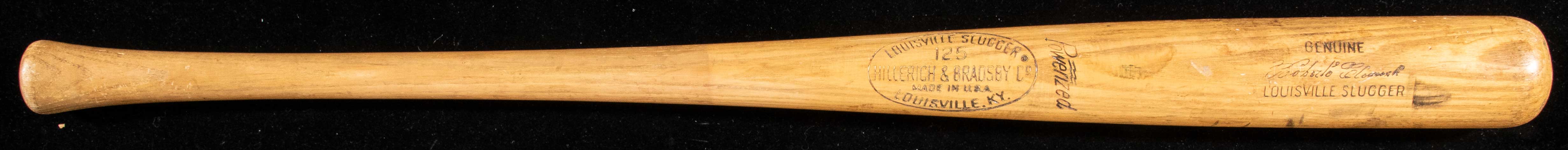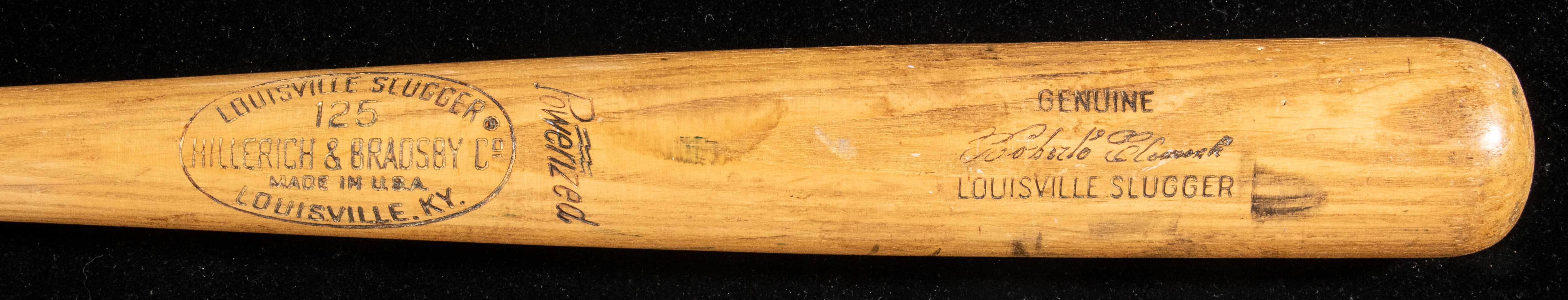 Description:Exceptional Roberto Clemente professional model baseball bat c.1965-68 - MVP and Batting title era (PSA/DNA GU 9.5) Louisville Slugger 125 model bat with Clemente facsimile signature in the barrel measures 36" long and weighs 37.2oz. Model number "U1" is factory stamped in the knob which has a period "21" player number marker notation. Outstanding use is evident throughout with ball and contact marks visible throughout the hitting surface. Cleat marks and black polish appear on the barrel along with green rack streaks. A slight handle crack has been expertly repaired. The bat dates to a particularly productive time in Clemente's career. He was named the National League Most Valuable player in 1966 and lead in average in both 1965 and 1967. With regard to player specific use characteristics, labeling period, and overall eye appeal the offered ranks among the better Clemente game bats which we have offered in some time. Includes LOA from PSA/DNA (GU 9.5): EX