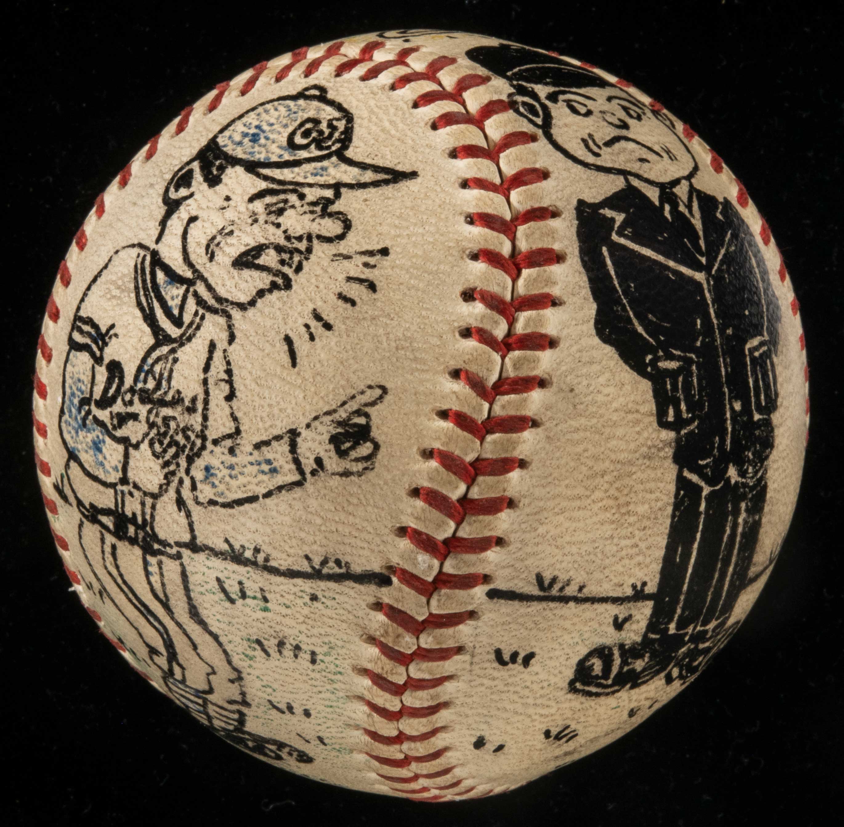 Description:Early George Sosnak hand decorated folk art baseball dated 1957. Spalding W.Giles Official National League baseball was hand decorated by the inimitable artist with India ink renderings of an umpire (complete with halo above head) being yelled at by a clearly agitated manager. Lettered on a side panel, "To Fin Prodger from Geo. H. Sosnak, Loads of Luck, 1957." This is among the earliest Sosnak folk art decorated baseballs which we have seen or offered and one to which he could surely relate having been an umpire himself. Ball displays mild soiling and light use/wear: EX