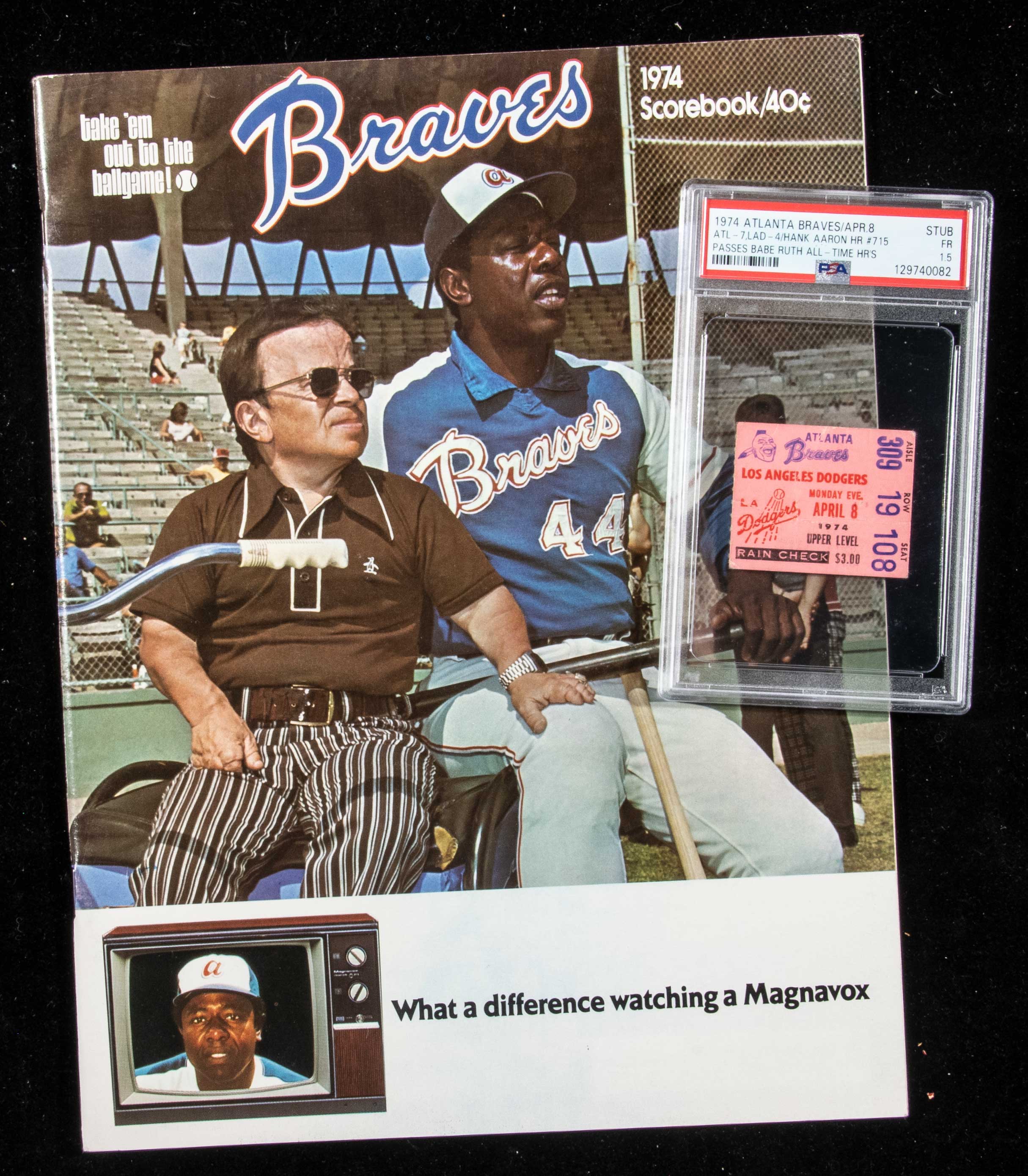 Description:April 8, 1974 Hank Aaron record setting 715th home run ticket stub (PSA FR 1.5) with program. Original ticket stub issued for the game played in Atlanta vs. the Dodgers. Hank Aaron hit his highly anticipated record setting 715th home run before a packed house. Displays at far better level than technical grade would indicate however there is creasing throughout. Includes a high grade unscored program: Ticket stub PSA FR 1.5, Program EX/MT-NM