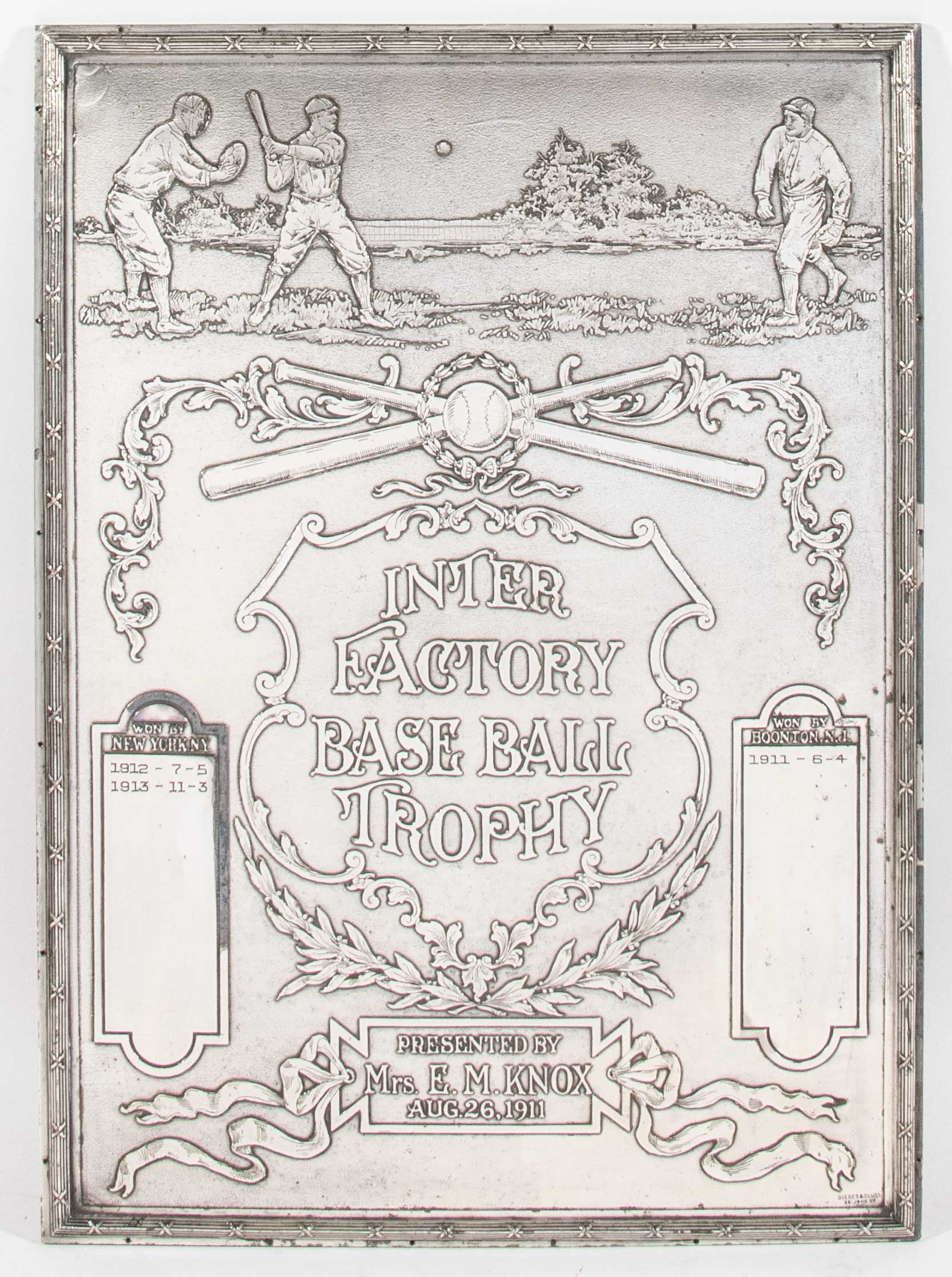 Description:Exceptional 1913 "Inter Factory Base Ball Trophy" plaque by Dieges & Clust. Very finely crafted silverplated wall placard measures an impressive 15"x21" and weighs just under 20-pounds. Depicts a game scene in relief across the top, with crossed bat and ball decoration below. Titling denotes the piece as being presented by Mrs. E.M. Knox in 1911, with scores of 1912 and 1913 games engraved. Stamped by noted silversmith company Dieges & Clust at the bottom right corner. Very striking display piece: EX/MT