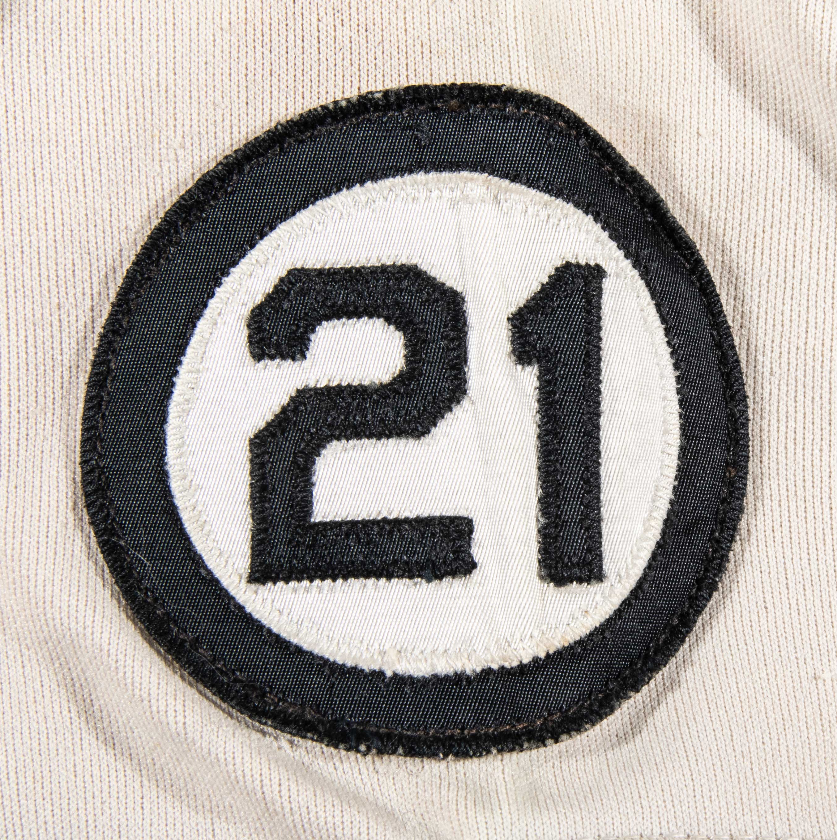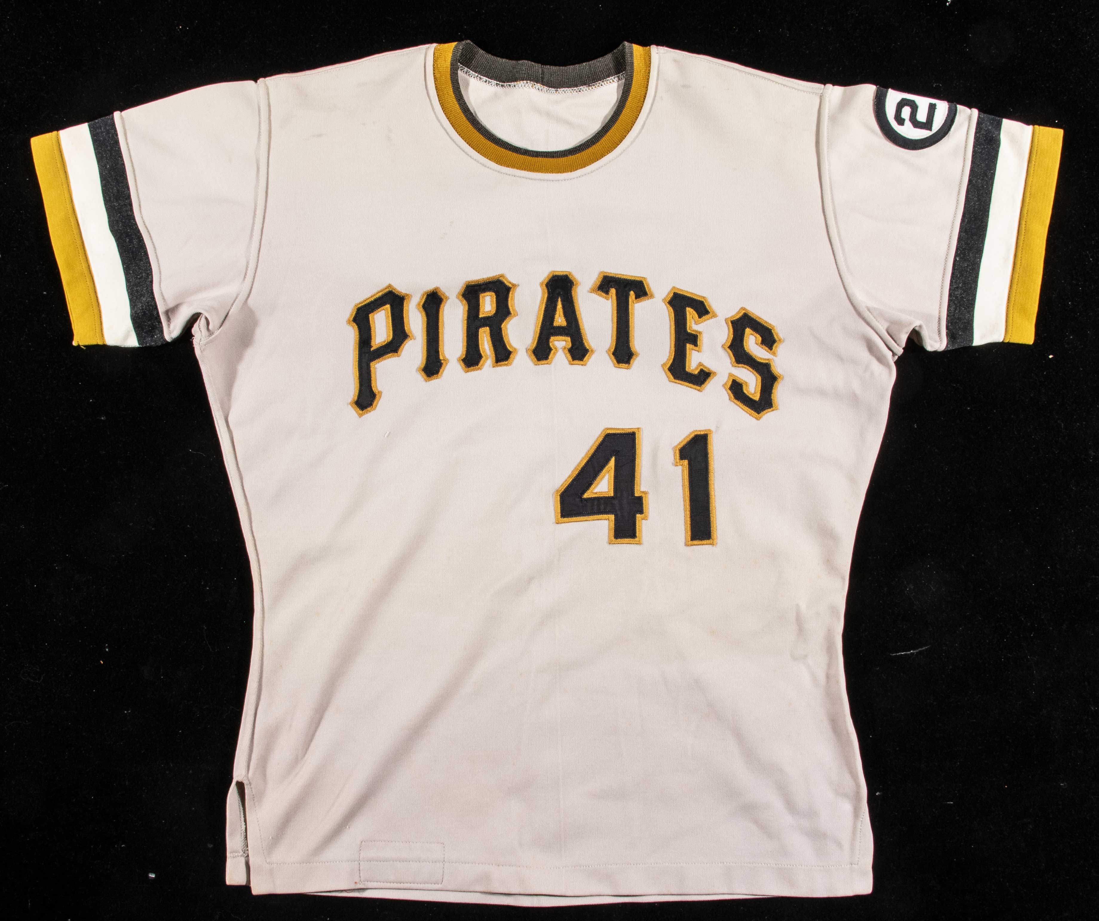 Description:1973 Roberto Clemente memorial patch on period c.1972 Pittsburgh Pirates professional model jersey. Rare and desirable team issued "21" patch which was worn by the Pittsburgh Pirates during the 1973 season in honor of the tragic passing of Roberto Clemente in December of 1972. It is affixed to a Pirates 1972 professional model road jersey. Jersey has its' original "Pirates" team name lettered across the front. The number "41" below and on back was placed on the shirt by the team, in the period, however the "1" numeral was changed in both cases. The patch also appears to have an outline of another around the perimeter. Rawlings tag on the inside front tail notes size (42) and there is an adjacent "Set 2 #8P 1972" flag tag attached. Use, wash, and some general age related wear are evident throughout. The number "41" was worn by Manager Bill Virdon at the time and it is likely that the Pirates prepared a 1972 jersey for his use in 1973. Includes LOA from Hunt Auctions: VG-EX