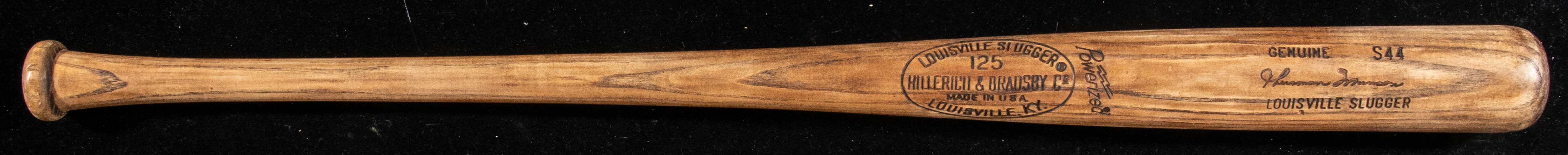 Description:Thurman Munson professional model baseball bat c.1978-79. Louisville Slugger 125 model S44 bat with Munson facsimile signature in the barrel measures 35" long and weighs 32.9oz. Uncracked with mild use including several ball and contact marks on the hitting surface. The absence of a lacquer finish and flame burning appear on Munson's factory ordering records from late 1978 into 1979. This was a particularly productive time for the Yankees who won the World Series in 1978 with the Captain behind the plate. PSA has noted in the included letter of authenticity that "player characteristics cannot be identified" inferring that while the bat was made for and shipped to Munson, there are no Munson specific use attributes. Includes LOA from PSA: EX