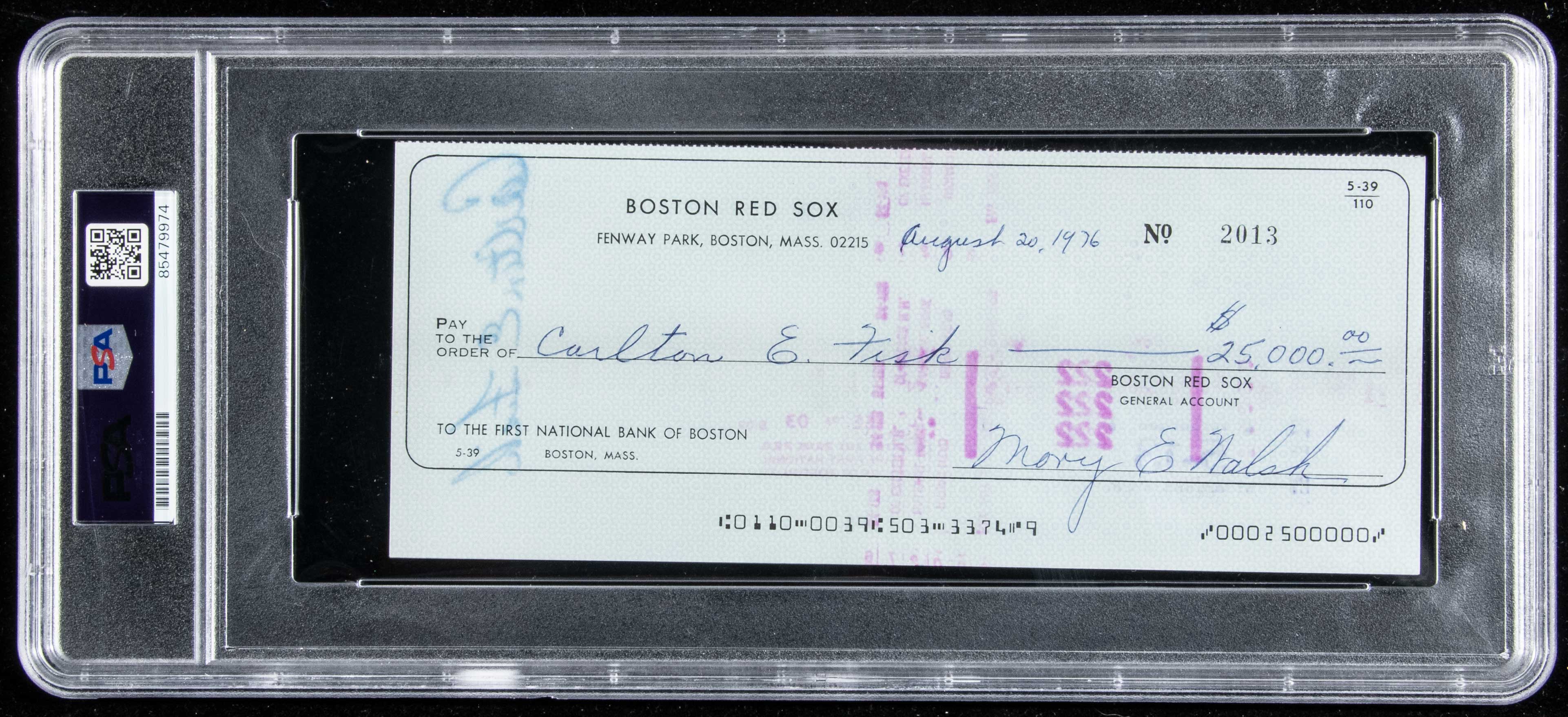 Description:1976 Carlton Fisk autographed Boston Red Sox payroll check (PSA/DNA NM 7). Boston Red Sox team issued check dated August 20, 1976 and made payable to Carlton Fisk. He has endorsed the back in ink with the autograph graded NM 7 by PSA. Handling wear and typical bank cancellations. Authenticated and encapsulated by PSA: PSA/DNA NM 7