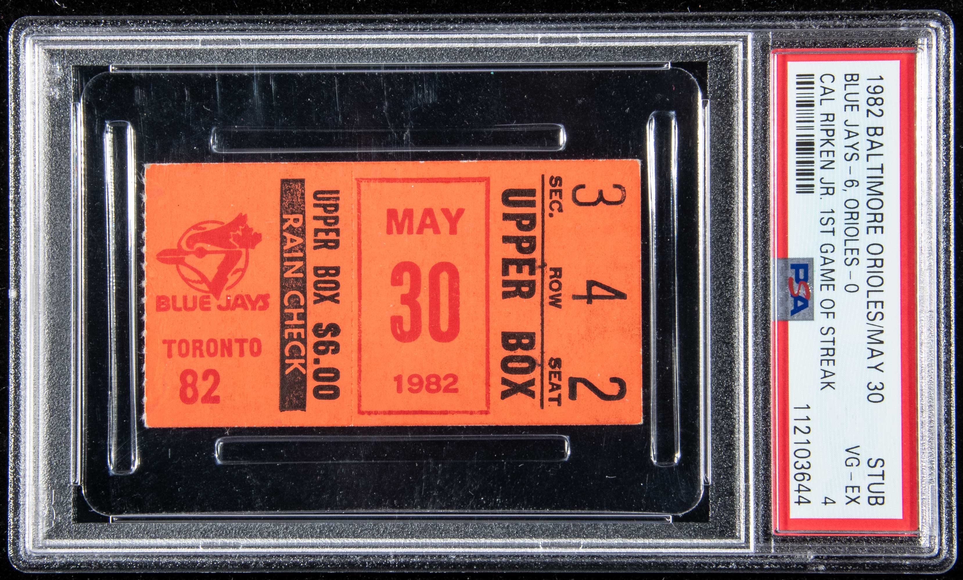 Description:May 30, 1982 Cal Ripken Jr. first game of "The Streak" ticket stub (PSA VG-EX 4) Rare original ticket stub issued for the Orioles vs. Blue Jays game played at Memorial Stadium. Cal Ripken Jr. appeared at third base and embarked on what would become a record streak of (2,632) consecutive games played. This ranks high among the very short list of sports related records which are likely to stand for the foreseeable future. In very sharp overall condition with a touch to corners and some very minor edge wear that is slightly more pronounced on the back. One of (10) which have been authenticated and encapsulated by PSA and there just (2) unqualified examples grading higher: PSA VG-EX 4