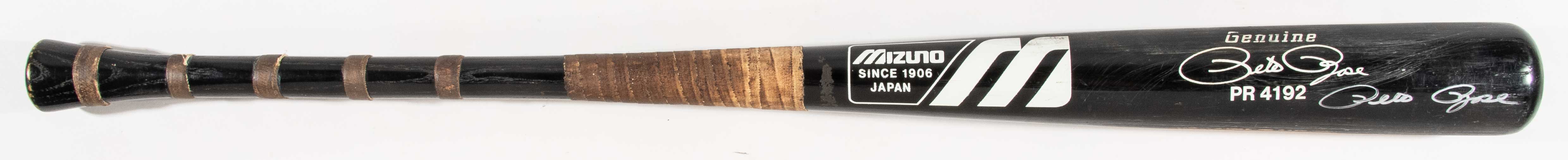 Description:Exceptional 1985 Pete Rose autographed professional model baseball bat - record breaking season (PSA/DNA GU 10) Mizuno brand bat with Pete Rose facsimile signature and model "PR4192." in block letter on the barrel measures 34" long and weighs 31.5oz. Uncracked with evident use including ball contact and stitch marks. In addition there is some minor grain swelling to the hitting surface and portions have been sanded with the black finish removed. This a Rose characteristic which has been observed on game bats dating to the late 1970s and 1980s. Original handle tape is likewise applied in trademark Rose fashion with (5) rings on the lower portion and the upper bearing a wider covering. All of these have a nice coating of pine tar. Signed "Pete Rose" in silver marker rating 8 out of 10. On September 11, 1985 Rose would collect career hit number (4,192) to pass Ty Cobb and stand alone as baseball's all-time leader in hits. In was an historic season and a monumental accomplishment leaving behind one of the few records across the spectrum of sports which is likely to never be broken. Includes auction LOA from JSA and LOA from PSA/DNA (graded GU 10): EX
