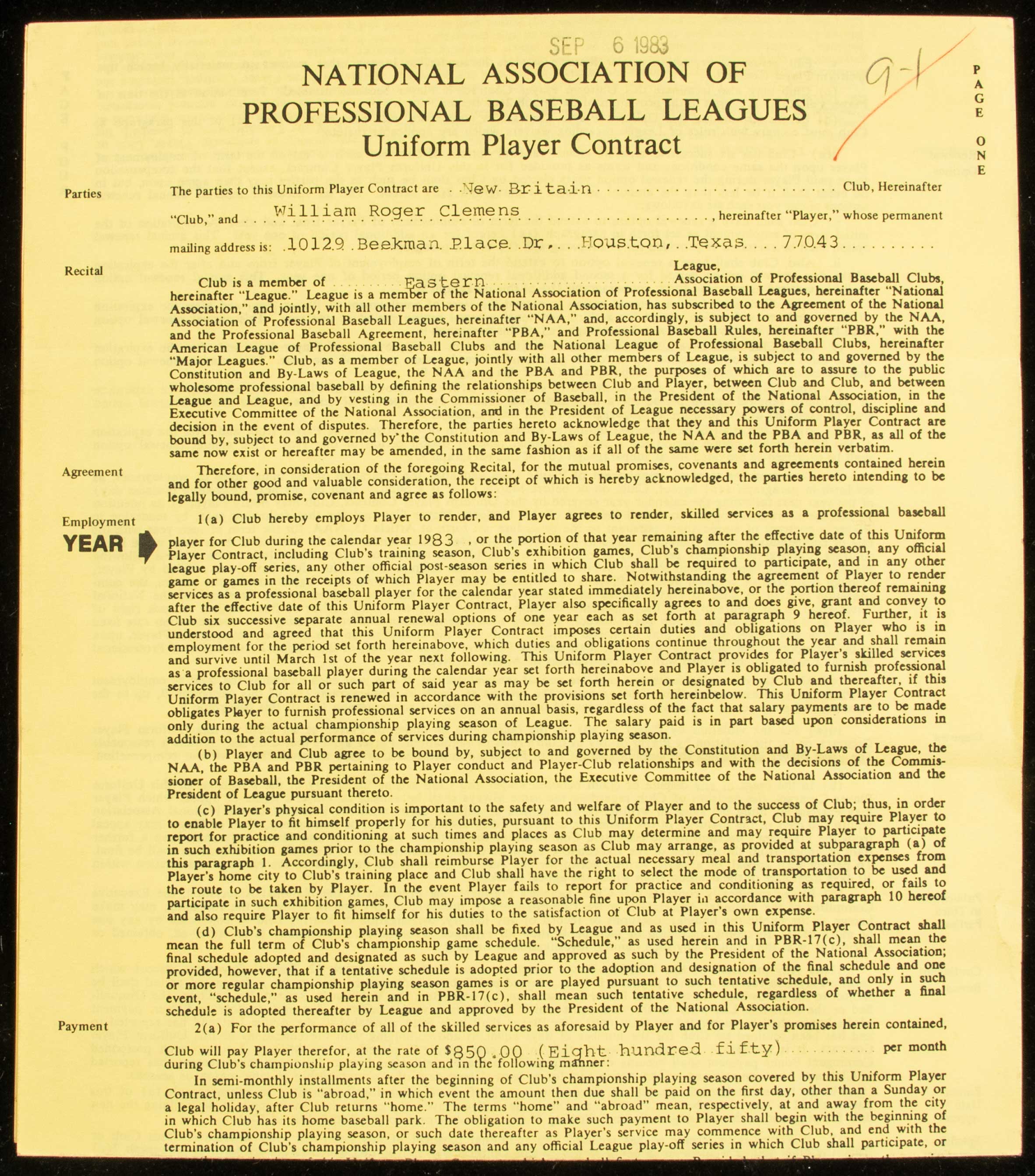 Description:1983 Roger Clemens autographed New Britain Red Sox player's contract. National Association of Professional Baseball Leagues Uniform Player Contract covered the terms of Roger Clemens time spent with Boston Red Sox AA Eastern League affiliate in New Britain. Dated September 1, 1983 and signed "Roger Clemens" in ink rating 9 out of 10. Also signed by a team representative and there is a stamped signature of the League President. Typical fold lines and some other light wear. Clemens would make a stop in Pawtucket to following year and then join the Red Sox Major League roster. Includes auction LOA from JSA: Sig. NM, Contract VG