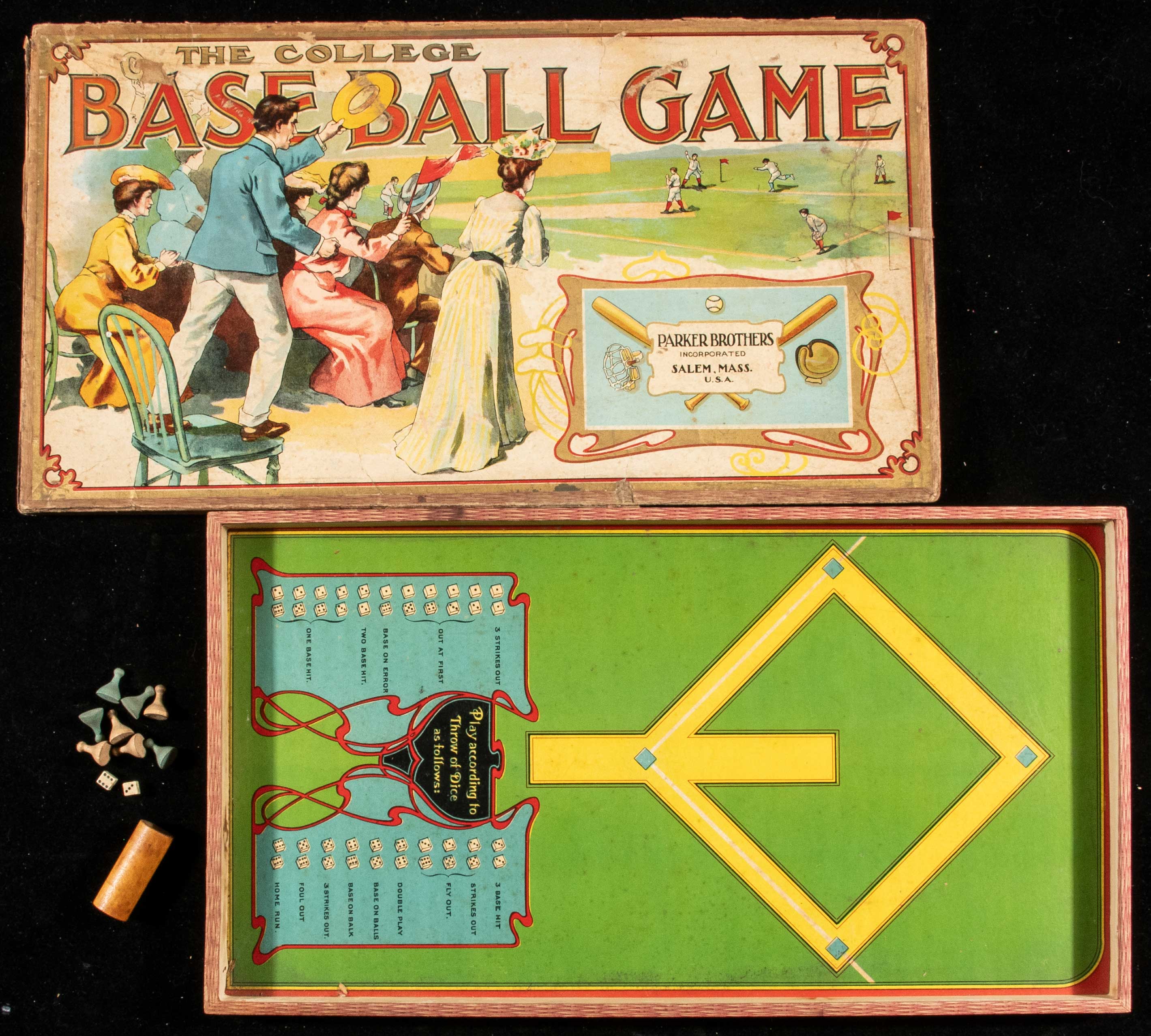 Description:Parker Brothers "The College Base Ball Game" c.1910s. 11.5"x20.5" lithographic lid depicts a colorful baseball scene. The lid has some scattered flaws including scuffs, discoloration, a few creases, and an area on the right side where the creases crack both the front and back surfaces. Side flaps are missing some portions. Playing board inside shows some light wear and the game includes some of its original pieces, but not all: GD