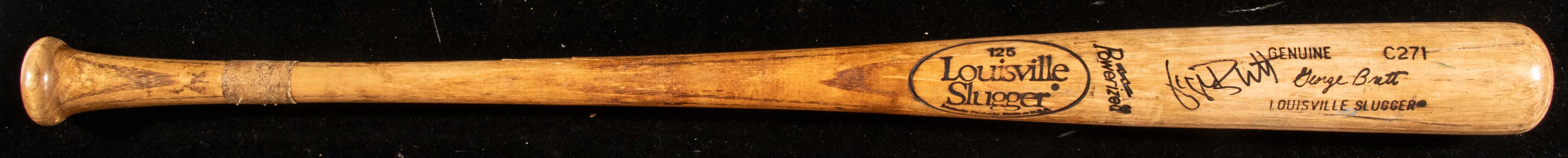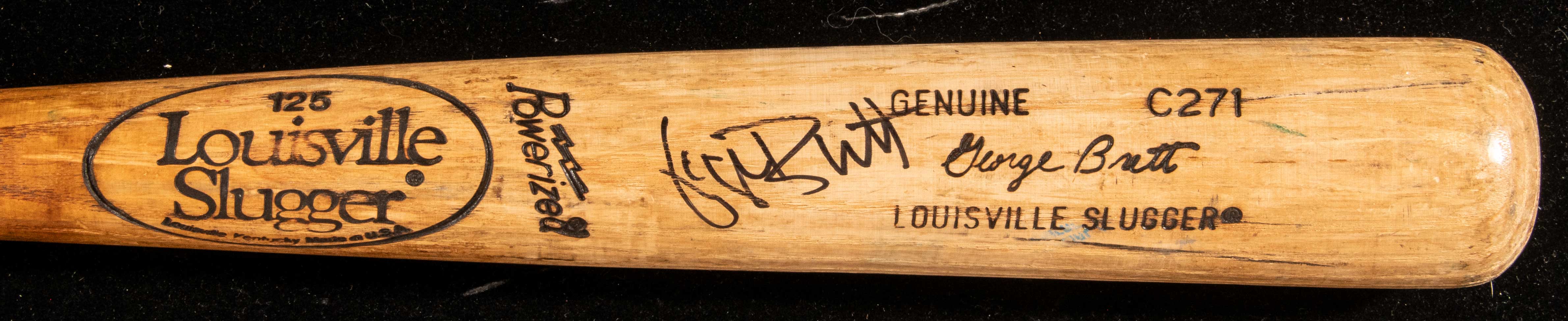 Description:Outstanding George Brett autographed professional model baseball bat c.1988-89 (PSA/DNA "GU 9.5"). Louisville Slugger 125 model C271 bat with Brett facsimile signature in the barrel measures 33.5" long and weighs 30.4oz. "LOU" is written on the knob in vintage marker, a nod to Brett's older brother whom had given him that nickname. Outstanding use is evident throughout with many ball, contact, and stitch marks covering the hitting surface. Ball marks include blue ink transfers and there are cleat marks on one side of the barrel. A nice coat of pine tar remains on the handle, which has a minor crack, and there is a ring of tape applied above the knob to aid in grip. Signed "George Brett" in marker rating 8/9 out of 10. An exceptional example with strong eye appeal dating to the period in which Brett won his third Silver Slugger Award. Includes auction LOA from JSA and LOA PSA/DNA (graded "GU 9.5"): EX