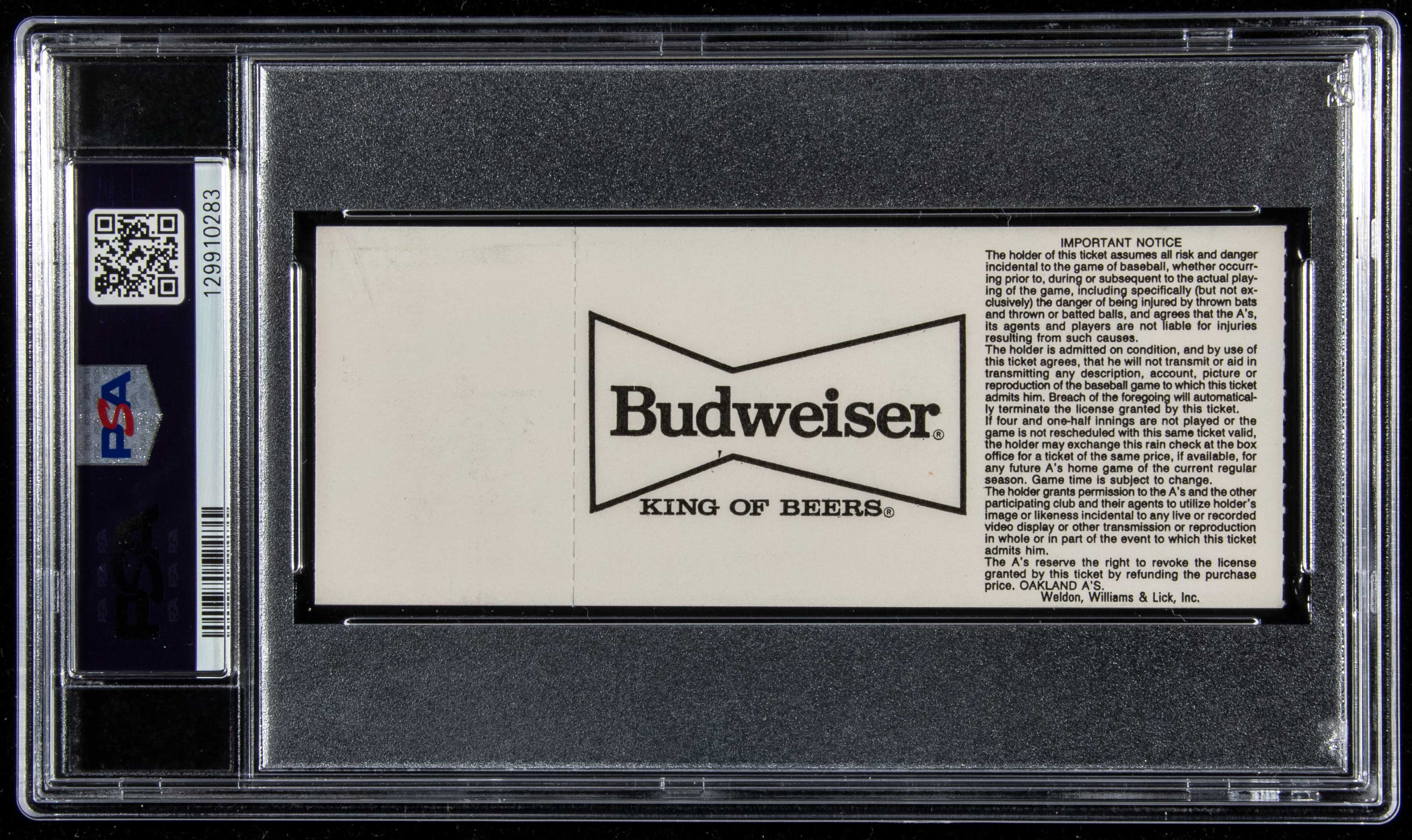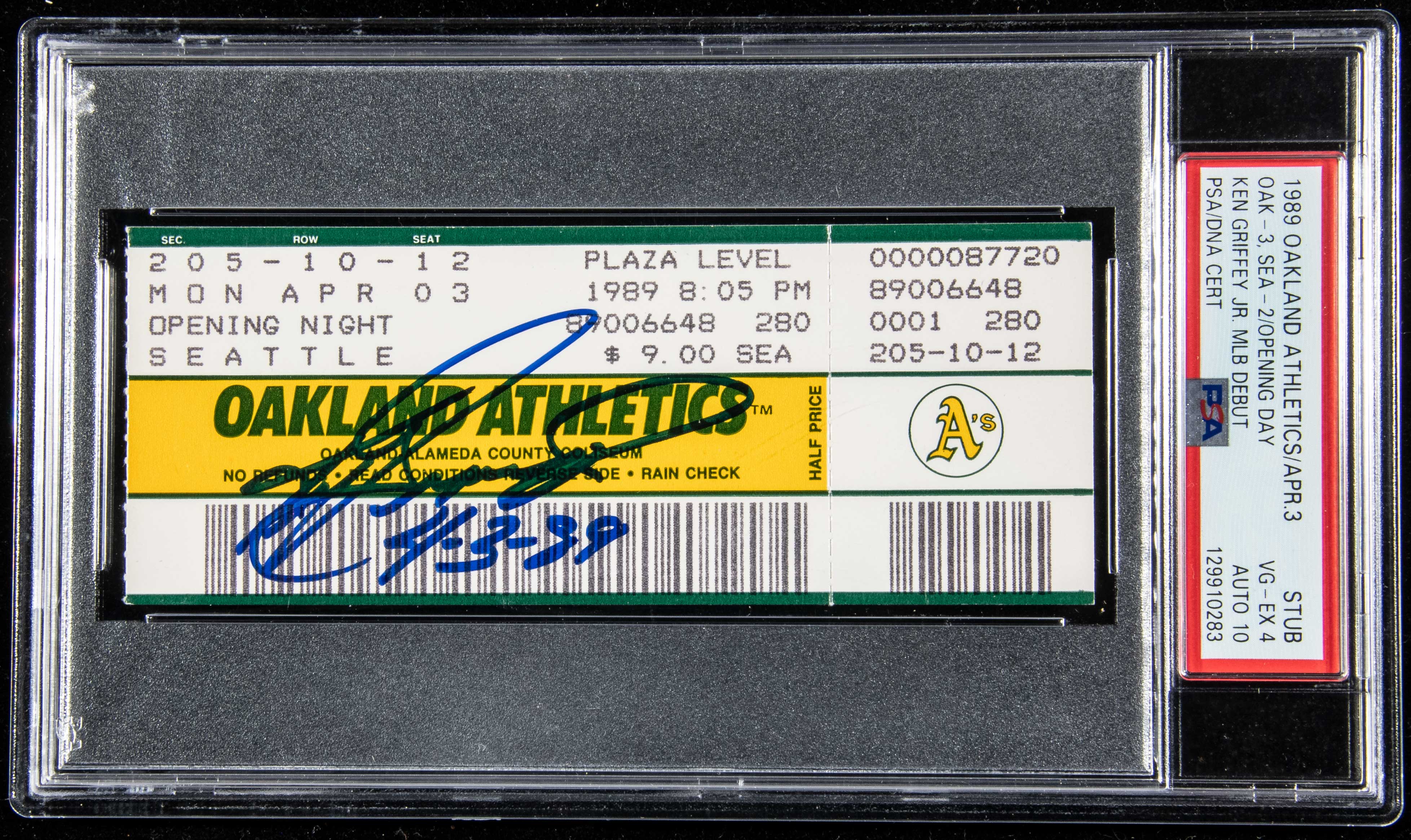Description:Rare April 3, 1989 Ken Griffey Jr. autographed and date inscribed Major League Debut ticket stub (PSA VG-EX 4 with 10 autograph). Original ticket stub issued for the Mariners vs. Athletics game played in Oakland in which Ken Griffey Jr. made his historic MLB debut. He would remain a fixture in the game for the next (2) decades and along the way played some of the most exciting baseball of a generation. Interest in all things Griffey related has always been high and the PSA population report noting that they have authenticated and encapsulated only (12) autographed stubs from this game speaks to the rarity of this ticket. The offered example is graded VG-EX 4 (exceptional appearance for the grade and we can only presume that there is a minute surface imperfection which cannot be seen through the holder) with the signature a perfect "10." It was recently discovered within a long time Athletics collection where it has sat since the owner attended the game. Signed earlier this year with a rare "4-3-89" inscription. Among the most desirable modern-era sporting event ticket stubs we have offered: PSA VG-EX 4 with 10 autograph