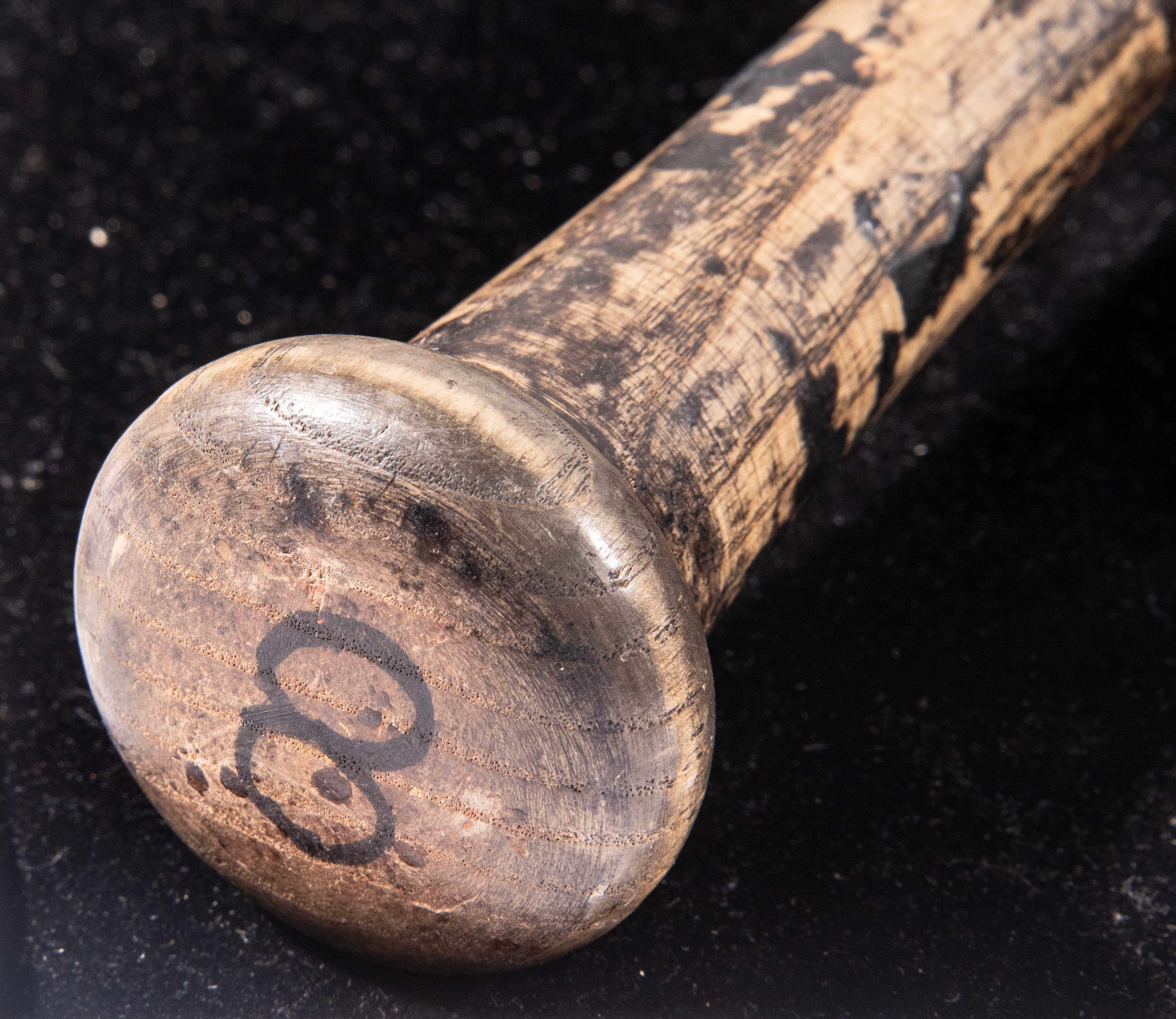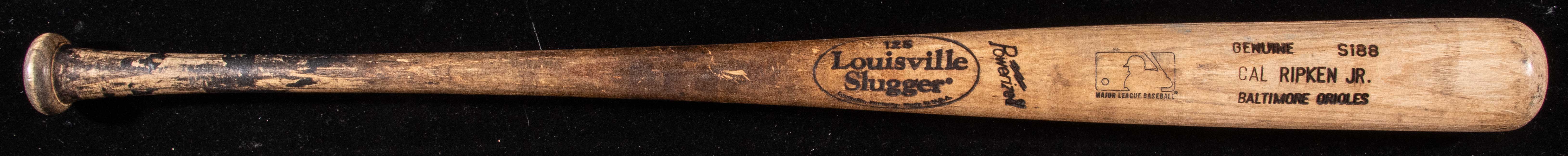 Description:1999 Cal Ripken Jr. professional model baseball bat (PSA/DNA GU 8). Louisville Slugger 125 model baseball bat measures 35" long and weighs 32.7 ounces. Fine evident use throughout including ball marks, stitching impressions, grain swelling, blue ink transfer marks, and pine tar residue on the handle. Vestiges of handle tape are visible on the handle area which has been removed. Model S188 stamped on barrel end with vintage "8" written on knob end. Two orders for this specific bat date to January 22nd and March 4th of 1999 indicative of likely spring training use and possible subsequent regular season use. Includes LOA from PSA/DNA (GU 8): EX