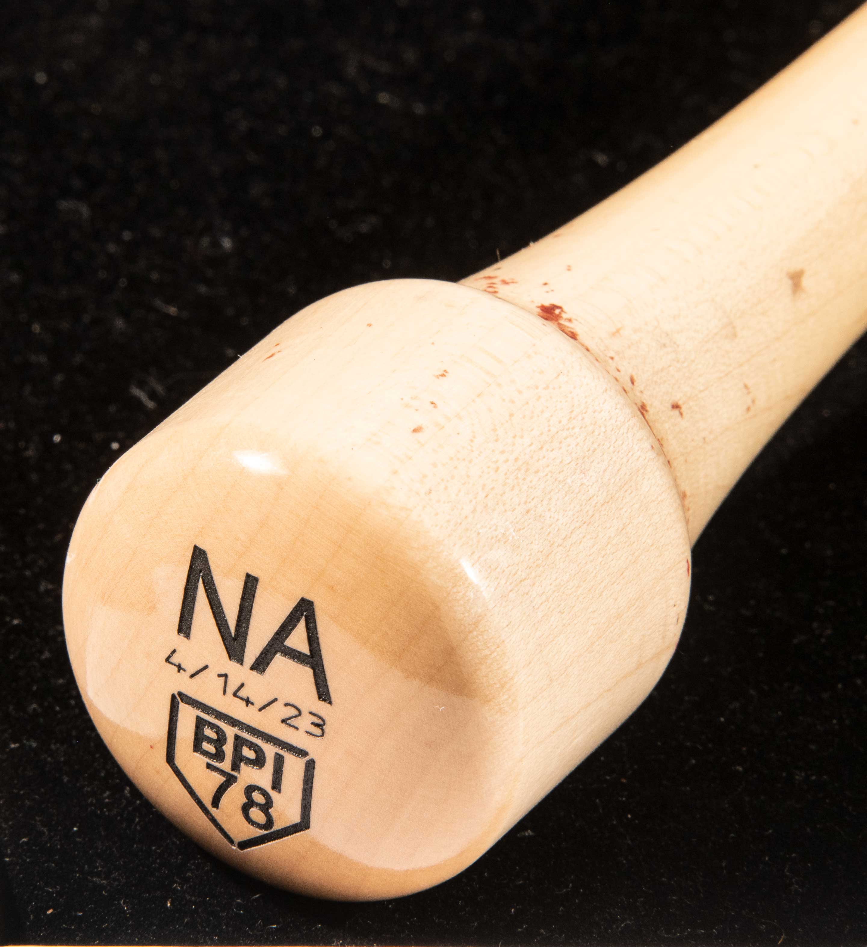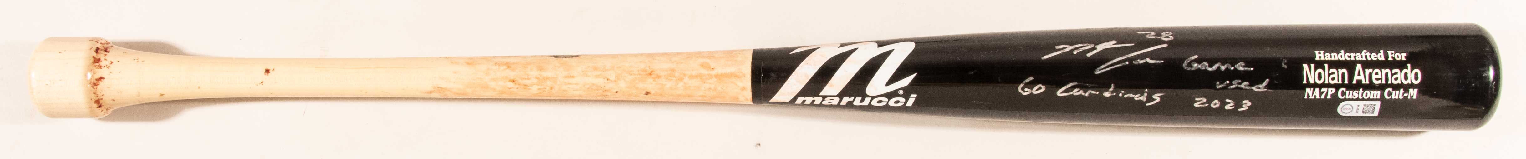 Description:2023 Nolan Arenado autographed and "game used" inscribed professional model baseball bat. Marucci model NA7P Custom Cut bat with Arenado's name block lettered in the barrel measures 35" long and weighs 32.6oz. "NA" initials, 4/14/23 production date, and (78) BPI markings are factory stamped in the knob. Uncracked with light evident use and there is a nice coat of pine tar on the handle. Signed in silver marker rating 7 out of 10 and inscribed "Go Cardinals, Game Used 2023." Arenado ranks among the best third basemen in recent history and has been awarded (10) Gold Gloves for his defensive play. No less a threat at the plate, he is a (5) time Silver Slugger Award winner and has twice lead the League in both home runs and RBI. In 2023 he earned his 8th All-Star appearance. Choice example for display with tremendous eye appeal from this future Hall of Famer. USA Sports Marketing hologram affixed and includes auction LOA from JSA and LOA from Hunt Auctions: EX