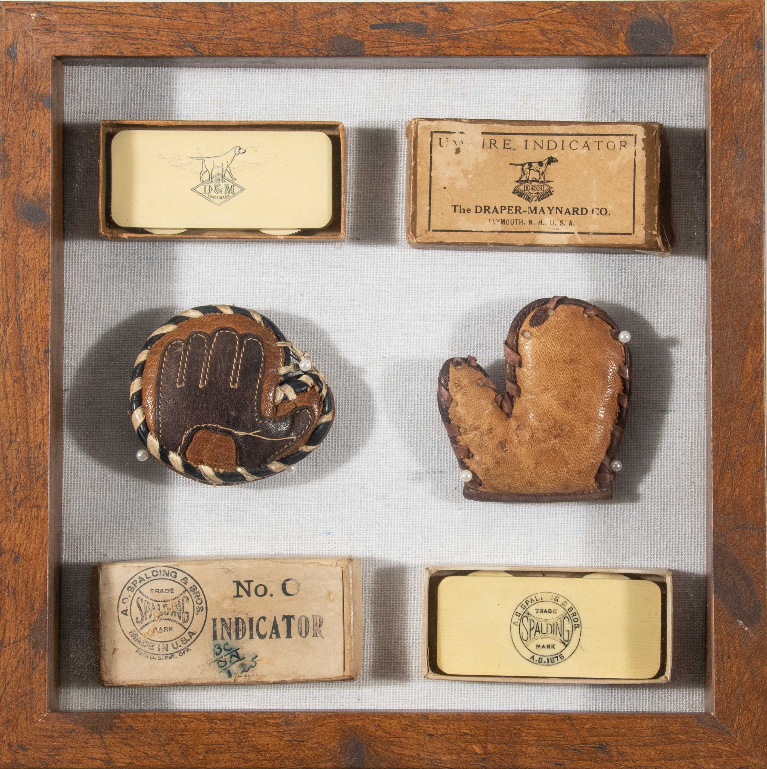 Description:Interesting c.1910s Spalding and D&M umpire indicators (and boxes) with mini gloves display. Handsome shadowbox display (10"x10"x2") includes a pair of early c.1910s umpire indicators with one marked Spalding and other by Draper & Maynard. They are mounted within the bottom halves of original period boxes with the lids displayed to one side. Both box lids some wear (D&M with more pronounced scuffing, Spalding has an ink notation). These pieces (indicators and all parts of boxes) are mounted either within each other or to the backing by unknown method but it does not appear that they can be removed. Salesman sample or souvenir sized baseman's' and catchers mitts done in leather are in between (these secured with pins and come out easily): See description