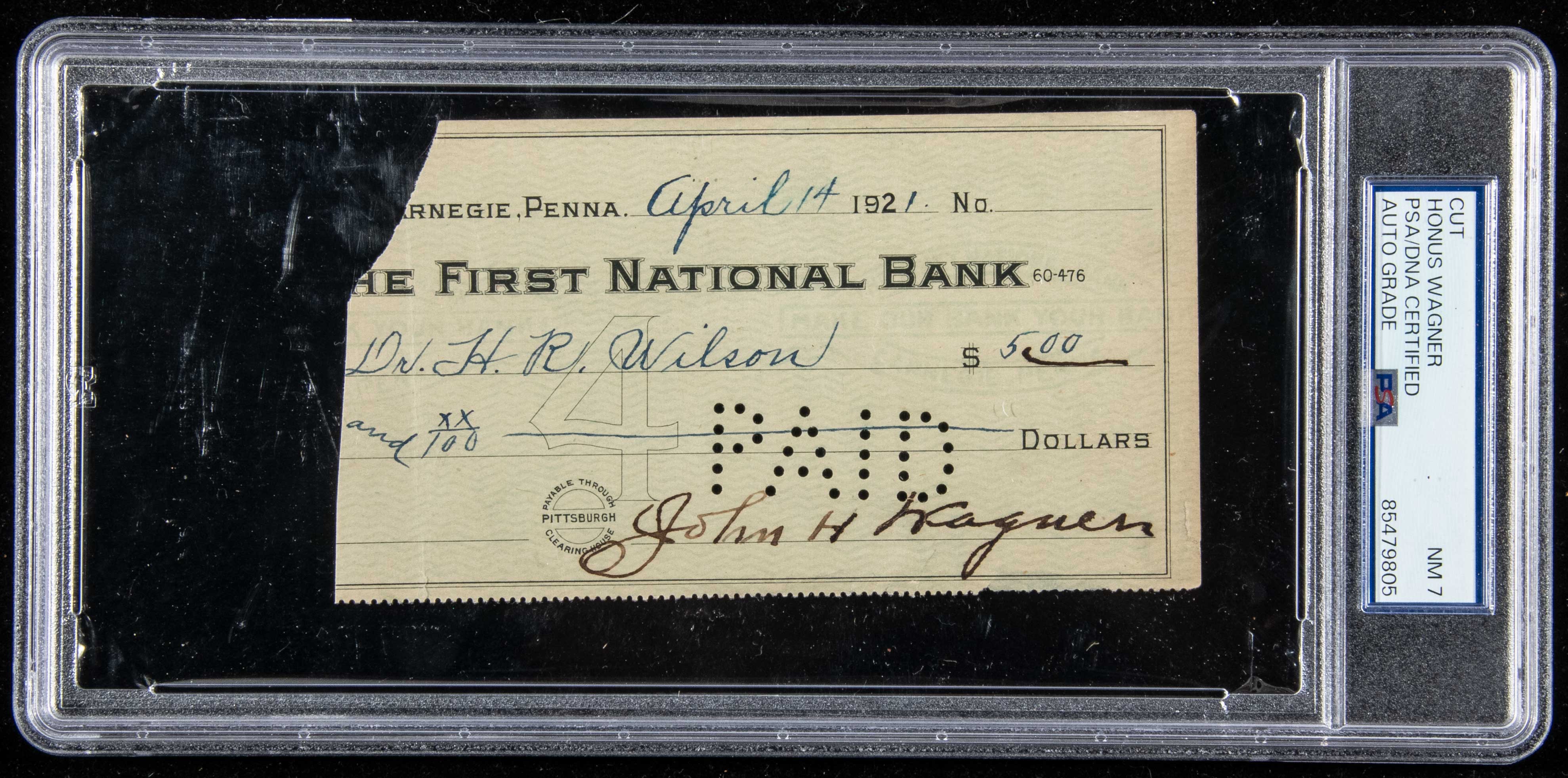 Description:1921 Honus Wagner autograph (personal check) (PSA/DNA NM 7). "John H Wagner" fountain pen signature appears on portion of a personal check which has the left hand side clipped off. Light wear with bank cancellation very minimally effecting the autograph. Authenticated and encapsulated by PSA with the autograph graded NM 7: PSA/DNA NM 7