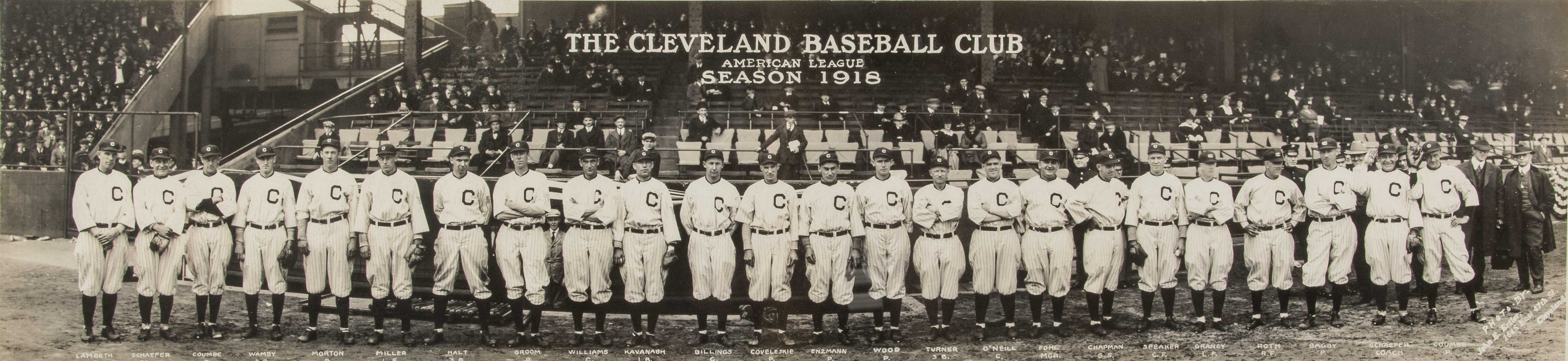 Description:1918 Cleveland Indians panoramic photograph with Tris Speaker and Ray Chapman. Choice large format photograph showing uniformed team members standing shoulder to shoulder inside League Park. Notables include Hall of Famers Tris Speaker and Stan Coveleski along with Smokey Joe Wood, Bill Wambsganss, and Ray Chapman who would tragically pass two years later. Each is identified below their likeness and of note are Germany Schaefer (Coach) and Fritz Coumbe (pitcher) who took advantage of the long exposure time needed to produce an image of this size. They can be seen on the left side with hands held at their waists and again on the right waving to the camera (having run from one side to the other). Titling appears across the top and there is a "Photo by John E. Ertler...Cleveland" mark at lower right. Tastefully framed to 13"x37" for display with mild wear including a few wrinkles, some modest toning/discoloration, and some minor paper loss within the lower white border. These flaws largely remain within the borders with the central image portion unaffected: GD/VG