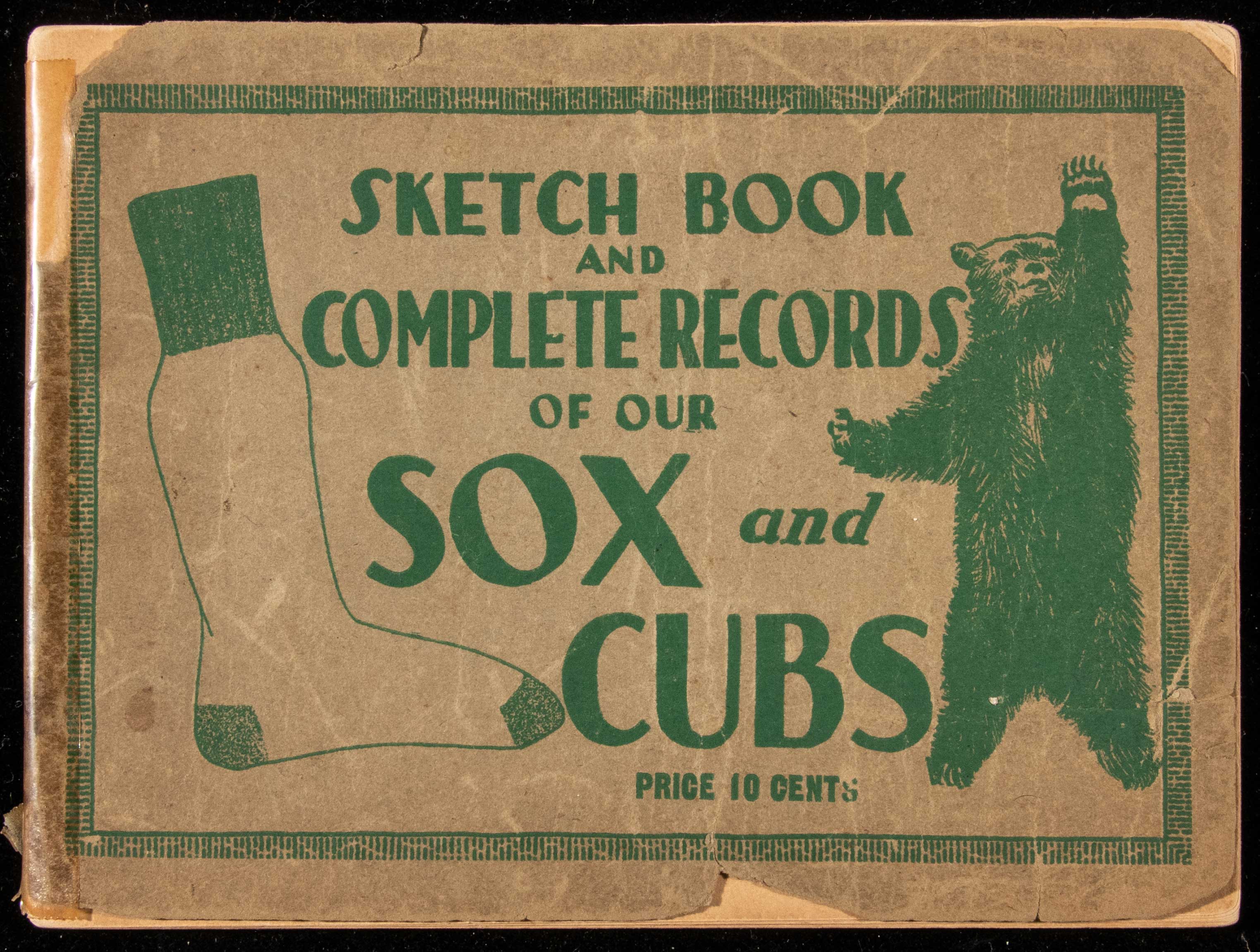 Description:1919 Chicago White Sox and Cubs Sketch Book. Souvenir "Sketch Book" published in 1919 by A.A. Prusank of Chicago featuring statistics and biographical information related to both the White Sox and Cubs. The Sox would claim an American League title that year before facing Cincinnati in the infamous World Series which a group of their players had conspired to throw. Covers have separated and are currently held in place with tape applied long ago that has now toned. In addition, they show chipping/loss, wrinkles, tears, and some additional flaws (more notably effecting the front). Interior pages are toned with some modest wear: FR