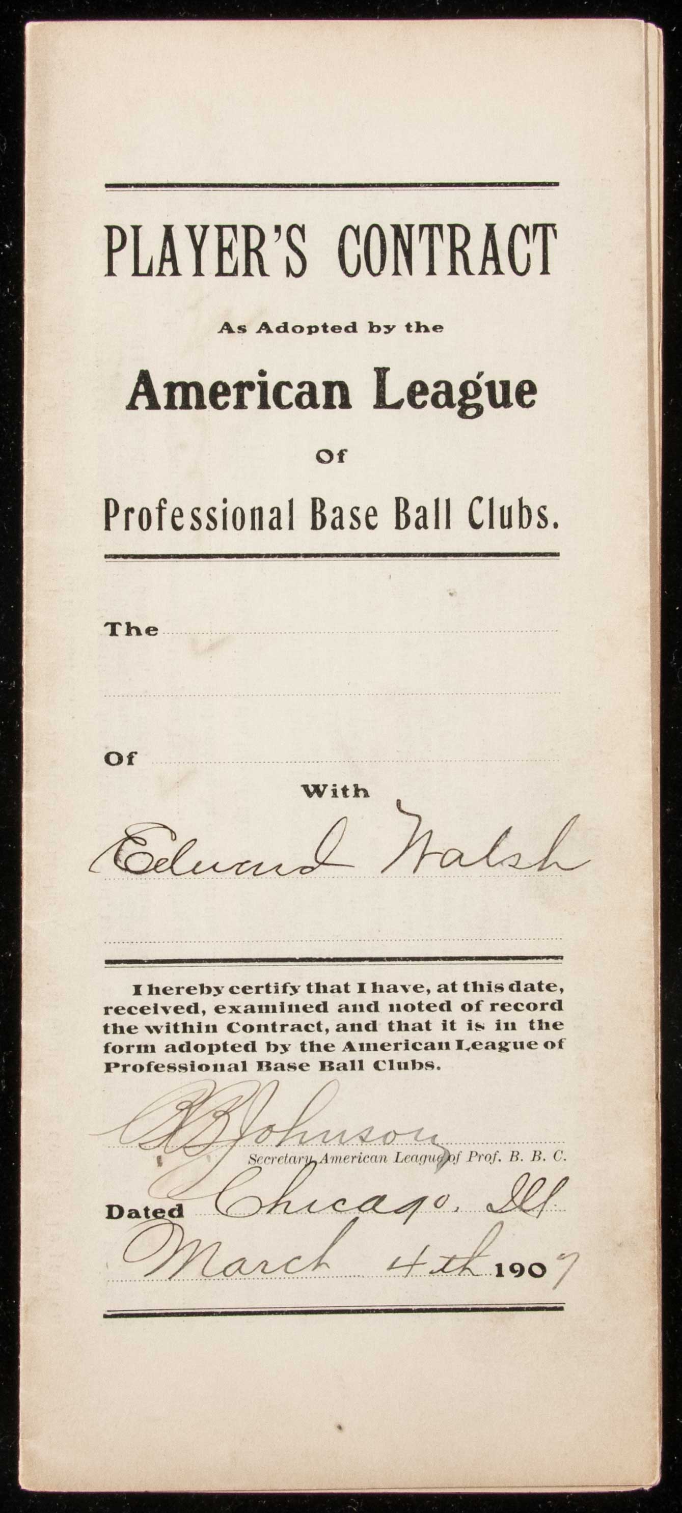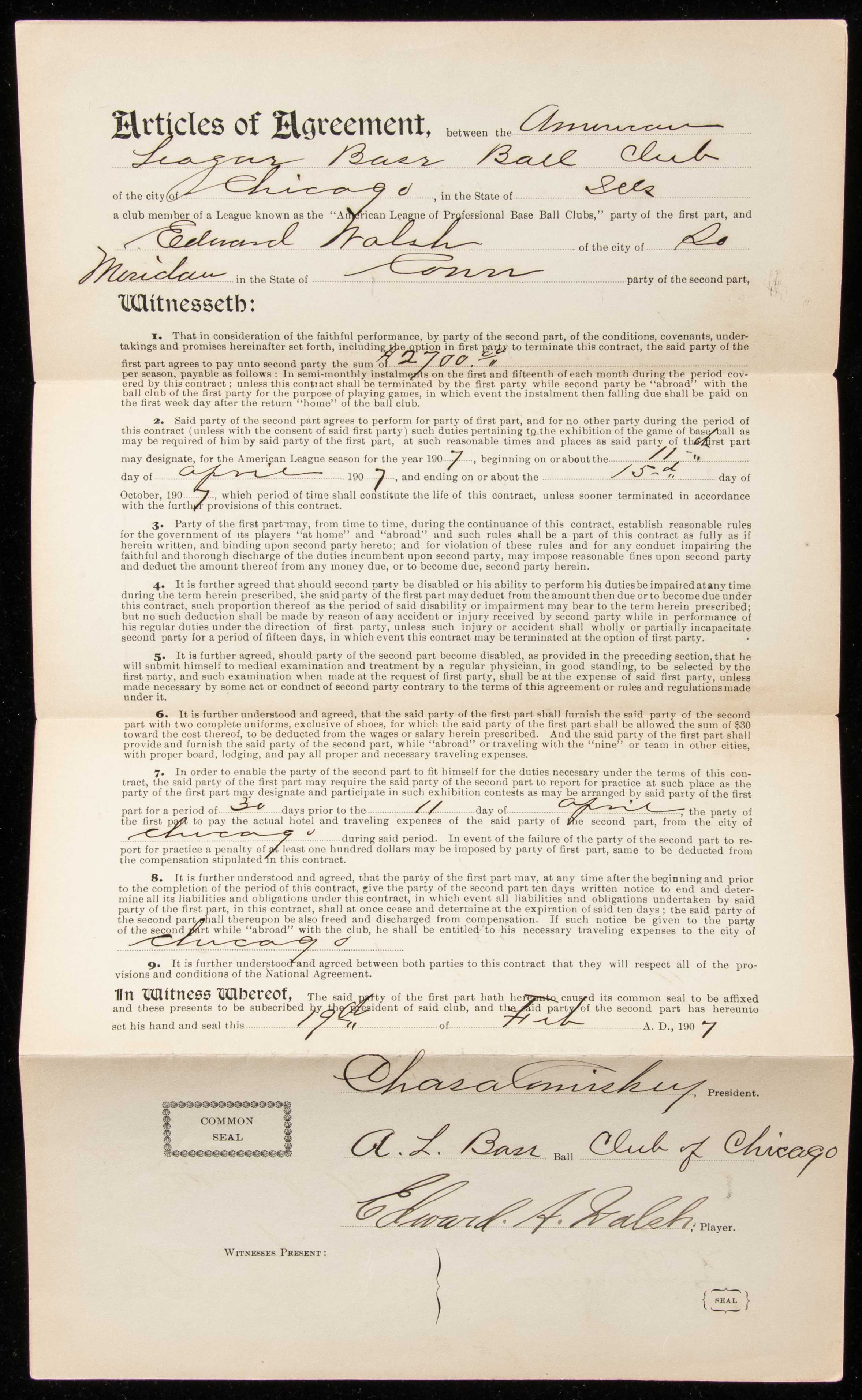 Description:1907 Ed Walsh autographed Chicago White Sox player's contract counter signed by Charles Comiskey and Ban Johnson: One of the earliest Hall of Fame examples ever offered. Original American League issued player's contract as executed between the Chicago White Sox and Hall of Famer Ed Walsh covering his terms of employment for the 1907 season. Walsh had made his debut with the team in 1904 and appeared in a handful of games through 1905. He took on a more regular role in 1906 and by 1907 was a full time member of their pitching rotation. He lead the American League in ERA that year (1.60) and threw for (422.1) innings. He would again surpass the (400) innings pitched mark the following year and is the last pitcher in history to reach that level. This all offered a glimpse of what was to come and his career (1.816) ERA is a Major League record which stands to this day. Contract is dated February 19, 1907 and called for a salary of $2,700. It is signed "Edward A. Walsh" by the player with team owner Charles Comiskey likewise adding his autograph just above. An additional signature of Ban Johnson, then American League President, appears on the back. All are done in fountain pen rating 8 out of 10 or better. Light toning and handling wear with typical folds. Among the earlier contracts which we have handled and certainly in the company of some of the more important from these formative years with note to it's having been issued to a Hall of Fame pitcher. Includes full LOA from JSA: Sigs. NM, Contract VG-EX