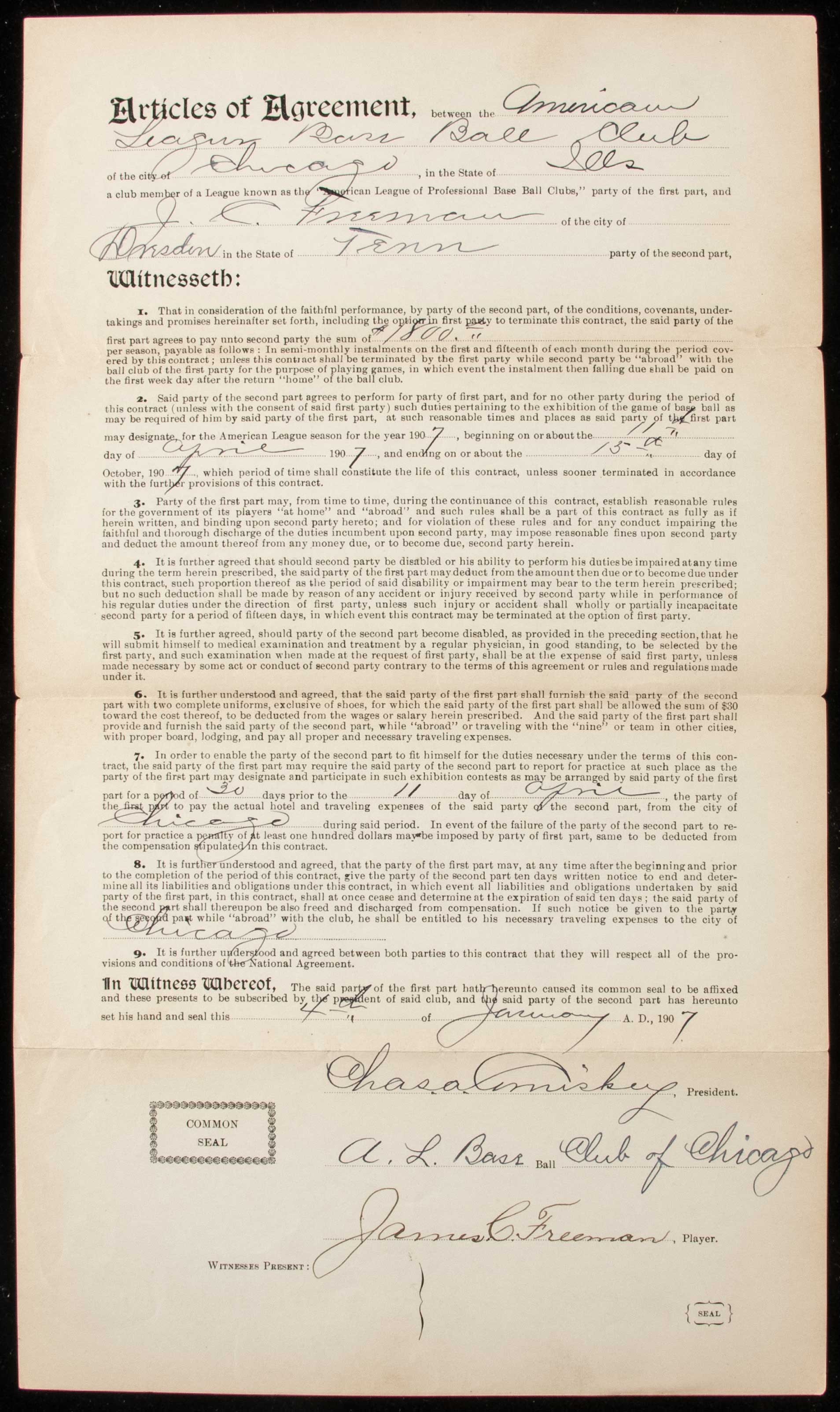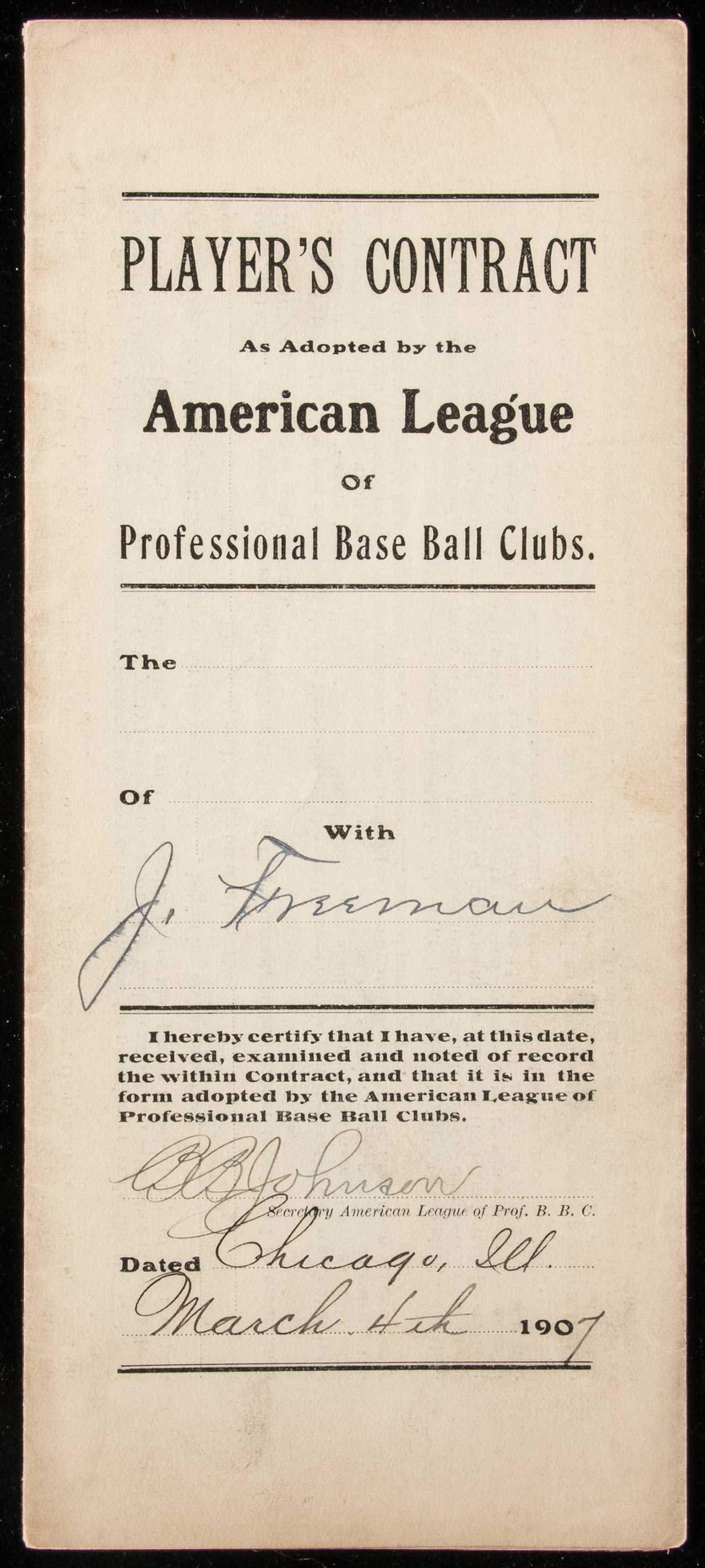 Description:1907 James Freeman autographed Chicago White Sox player's contract counter signed by Charles Comiskey Original player's contract as executed between the Chicago White Sox and Freman covering his terms of employment for the 1907 season. He did not land up making the roster that year. Contract is dated January 4, 1907 and has been signed "James C. Freeman" with Hall of Fame team owner Charles Comiskey likewise signing above. What appears to be a secretarial example of Ban Johnson, President of American League, appears on the back. All are done in fountain pen rating 7/8 out of 10 or better. Light handling and storage wear along with a touch of toning (slightly more pronounced in areas) and typical folds. Includes auction LOA from JSA: Sig. NM, Contract VG