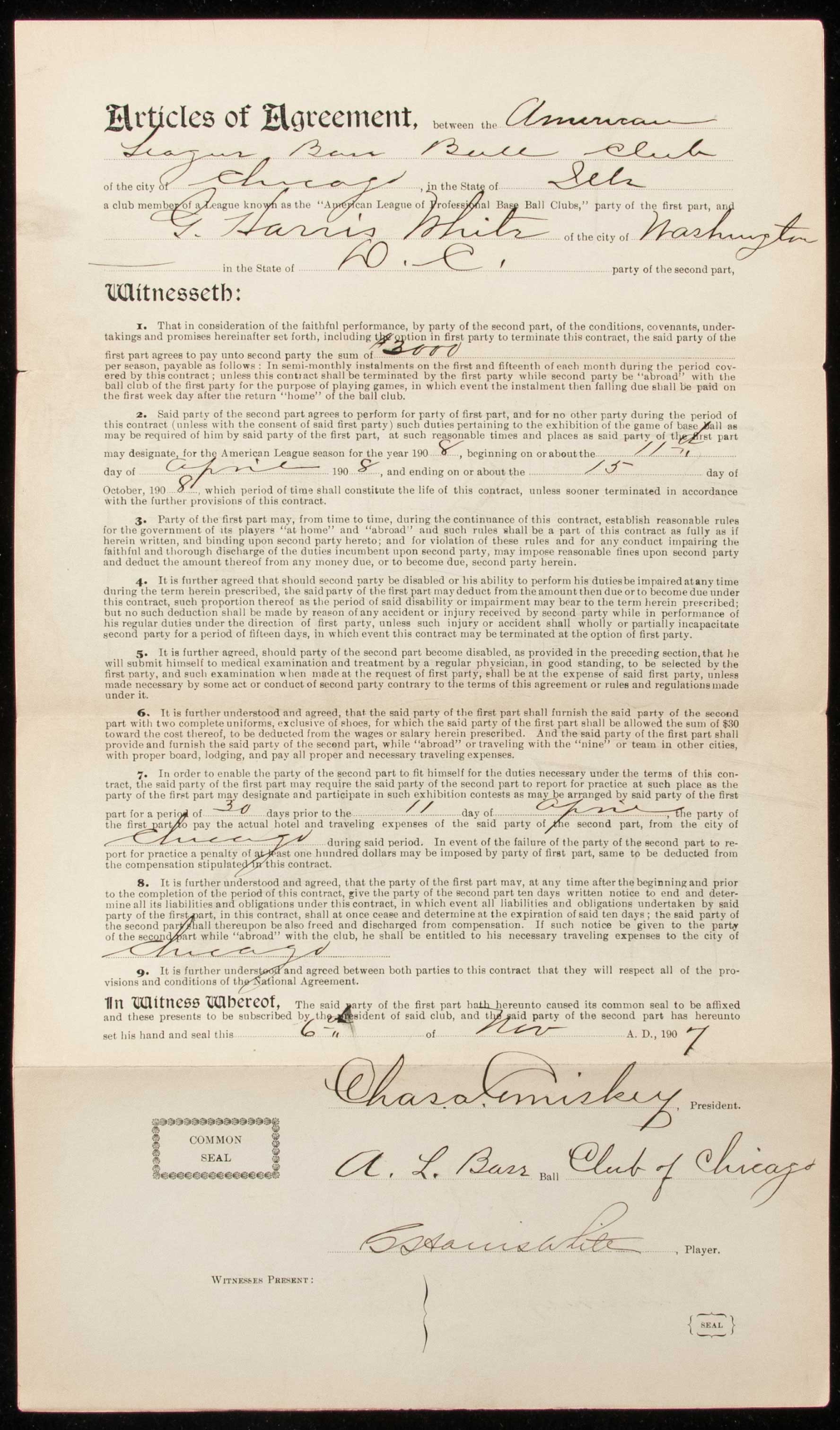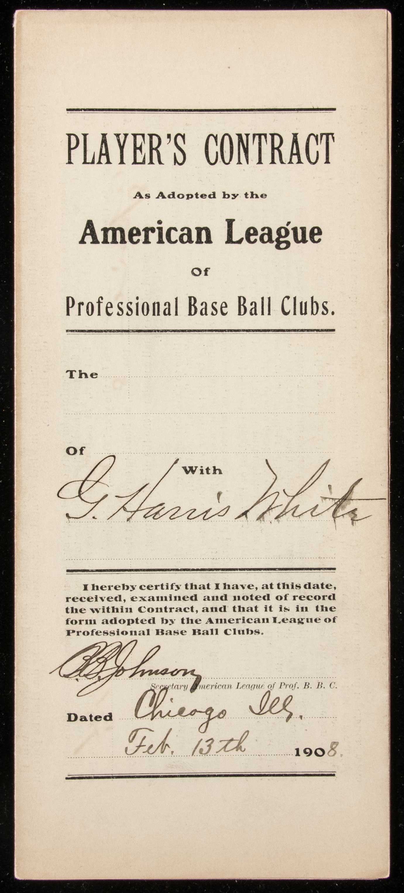 Description:1908 Doc White autographed Chicago White Sox player's contract counter signed by Charles Co miskey and Ban Johnson: T-206 Player subject. Original player's contract as executed between the Chicago White Sox and White covering his terms of employment for the 1908 season. He had been a member of their 1906 World Series Championship team. Contract is dated November 6, 1907 and has been signed "G. Harris White" with Hall of Fame team owner Charles Comiskey likewise signing above. Ban Johnson, President of American League, has signed the back. All are done in fountain pen rating 8 out of 10 or better. Light handling and storage wear along with a touch of toning (slightly more pronounced in areas) and typical folds. Includes auction LOA from JSA: Sig. NM, Contract VG