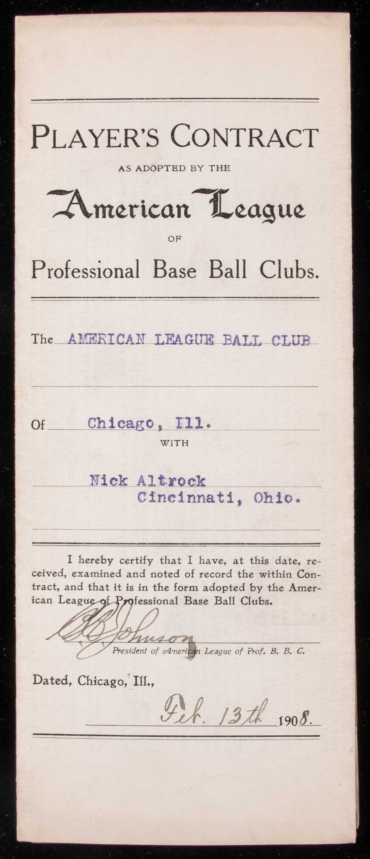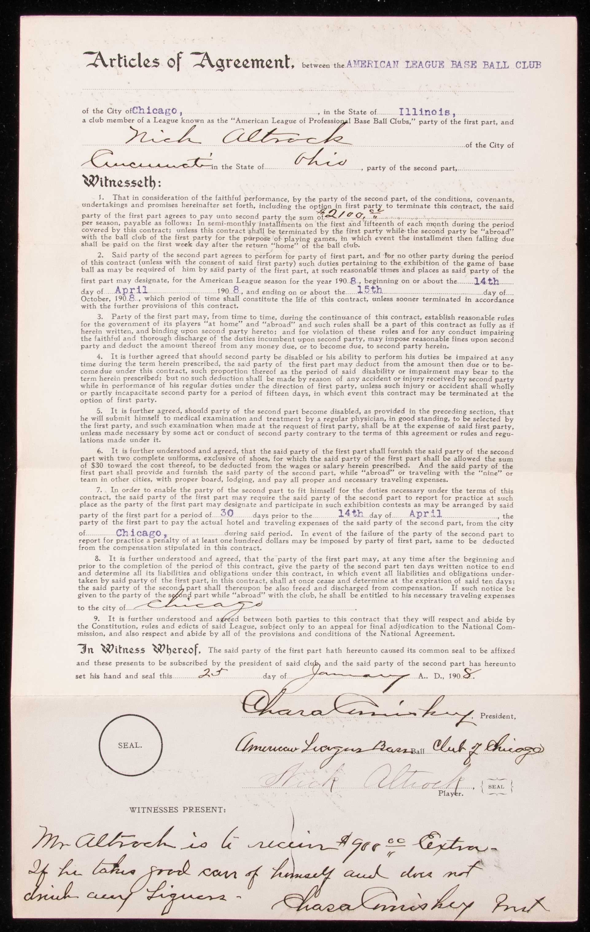 Description:1908 Nick Altrock autographed Chicago White Sox player's contract counter signed by Charles Comiskey and Ban Johnson. Original player's contract as executed between the Chicago White Sox and Altrock covering his terms of employment for the 1908 season. He had won a Championship with the team in 1906 but an arm injury that season would end his time as an effective pitcher. He remained in baseball for decades first as a pinch hitter and then transitioned into a long standing role as a Coach. Contract is dated January 25, 1908 and has been signed "Nick Altrock." Hall of Fame team owner Charles Comiskey has signed just above and added a handwritten provision below ("...$900 extra if he takes good care of himself and does not drink any liquors") with his autograph again appearing below. The signature of Ban Johnson, President of American League, is on the back. All are done in fountain pen with Altrock rating 7 out of 10 and the others are stronger (8-8/9). Light handling and storage wear along with typical folds. Includes auction LOA from JSA: Sig. NM, Contract VG