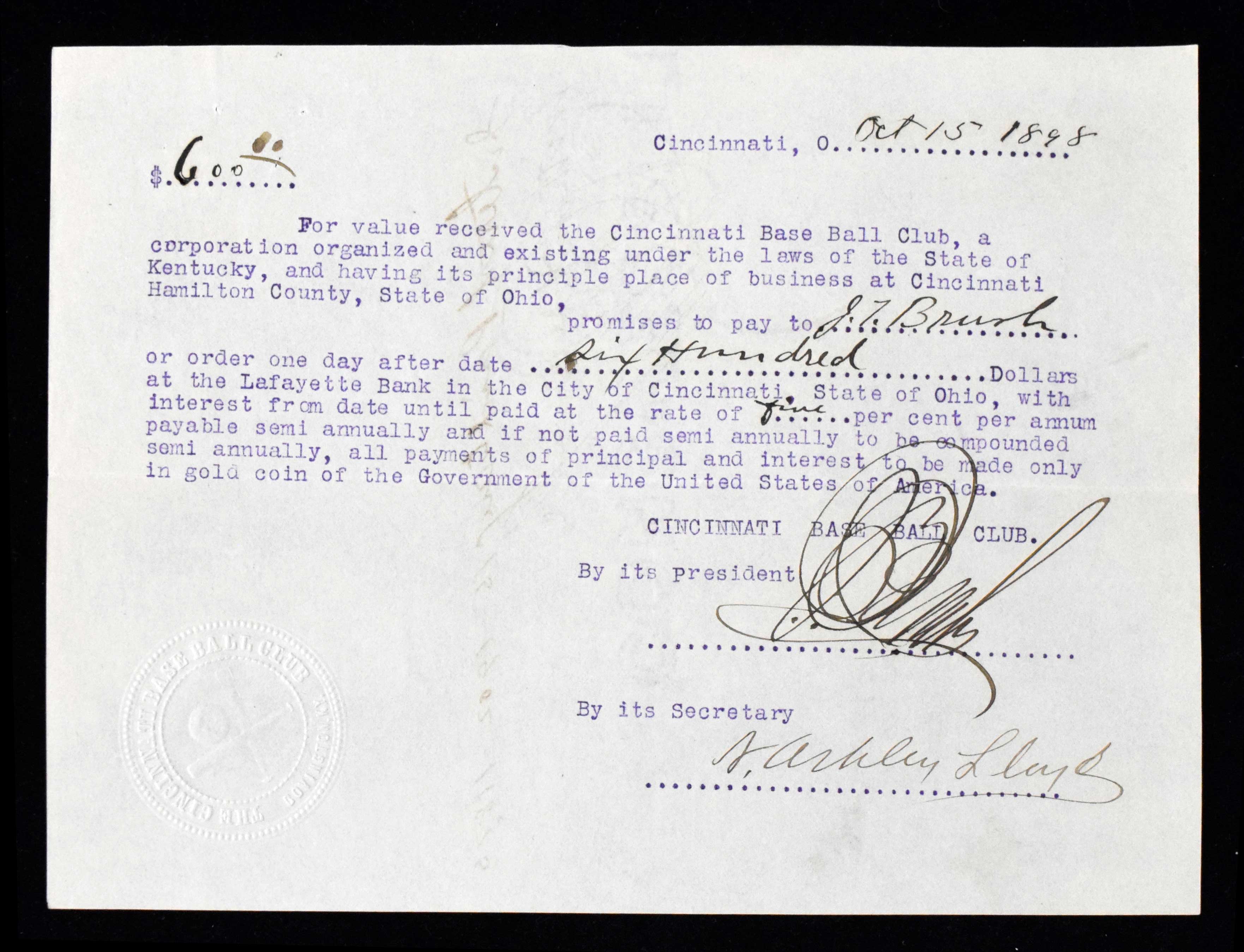 Description:1898 John T. Brush twice autographed Cincinnati Baseball Club financial document. October 15, 1898 dated typewritten document related to monies owed to Brush, then owner of the New York Giants, by the Cincinnati Baseball Club. Signed once on either side (with the signature on back below a notation that interest had been paid) in fountain pen rating 8-8/9 out of 10. Light toning with a horizontal fold and a hint of light wear otherwise. Includes auction LOA from JSA: EX-NM