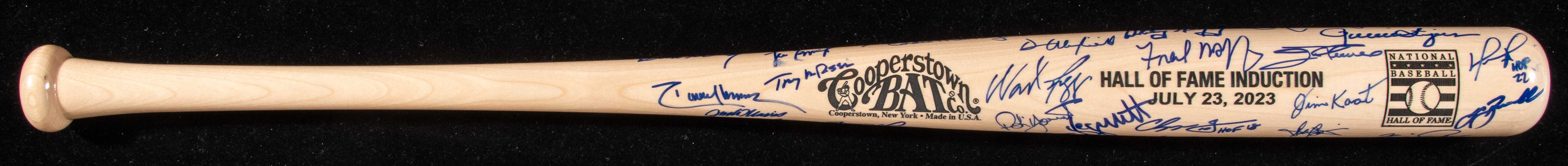 Description:2023 Baseball Hall of Fame Induction bat autographed by (50+) members. Commemorative bat done by Cooperstown Bat Co. has burned in text/titling (related to the 2023 Induction) and a Hall of Fame logo. Signed throughout by over (50) with notables including Derek Jeter, Ken Griffey Jr, David Ortiz, George Brett, Jeff Bagwell, Randy Johnson, Johnny Bench, Rickey Henderson, Cal Ripken Jr, Ozzie Smith, Frank Thomas, and others. Marker signatures rate 8 out of 10 or better with the exception of Ortiz (6 with smudge). In very strong overall condition with no mentionable flaws. Includes auction LOA from JSA and signed letter of provenance from Jim Kaat: NM with (1) signature lesser