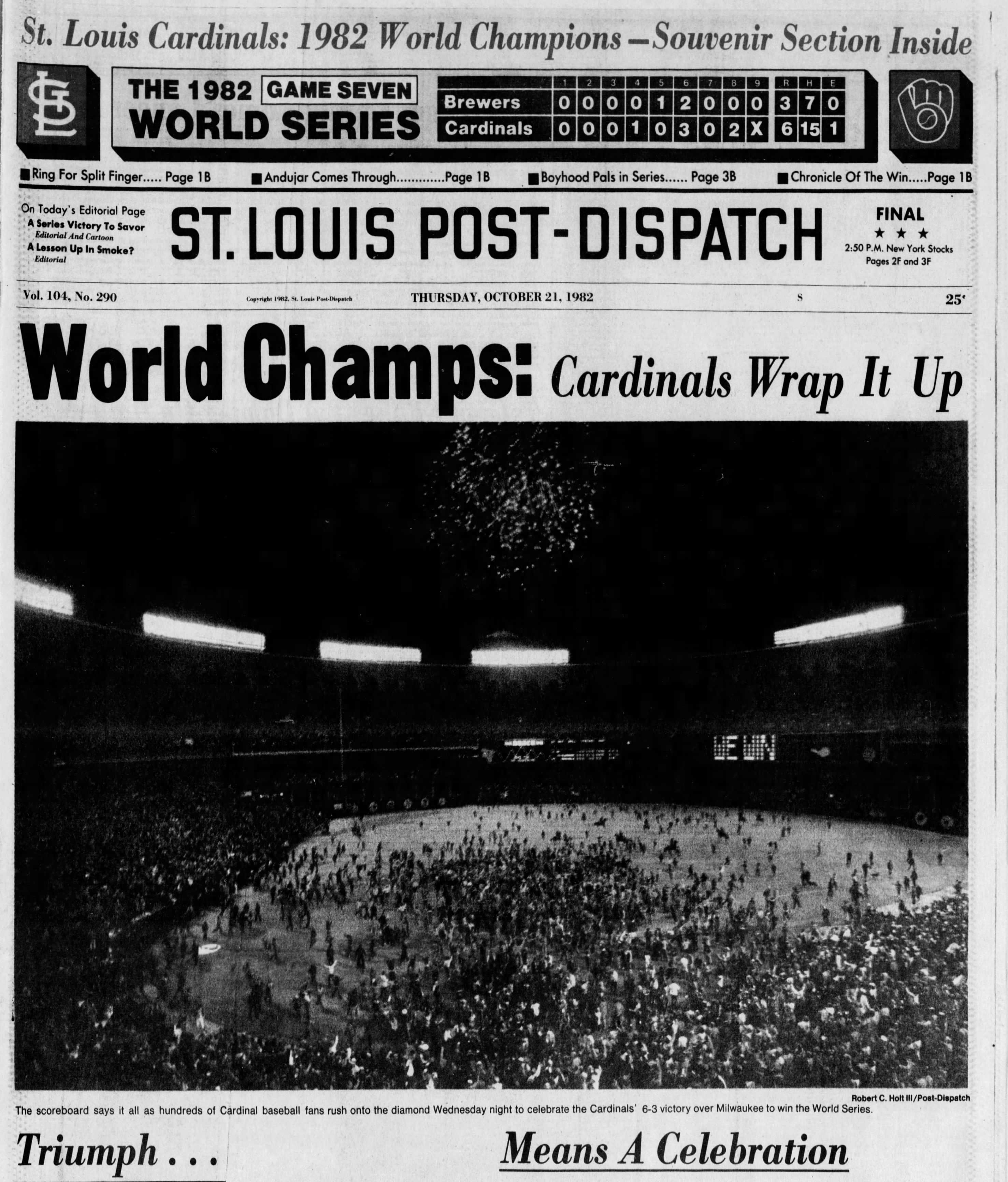 Description:1982 Jim Kaat St. Louis Cardinals World Series trophy. Figural trophy as presented to Kaat for his efforts as a member of the World Series Champion Cardinals team. High quality figural piece stands 11" tall with brass team name pennants encircling an upright circle which supports a crown finial. Cardinals and Brewers enameled World Series press pin facades adorn the base. A brass band wrapped around it reads "St. Louis Cardinals World Champions 1982 James Kaat" in block lettering. Original "Balfour" label is on the underside. Scattered wear includes some minor tarnish, very small amounts of loss to the team names on pennant, and it appears that the upright circular support was polished resulting in the removal of 99% of the brass colored finish. In addition the small baseball which sits on the base has either been replaced or the original was painted over in white. A highly desirable symbol of the Cardinals Championship and further enhanced with the lineage to a Hall of Fame player. Includes signed letter of provenance from Jim Kaat: EX-EX/MT with note to description