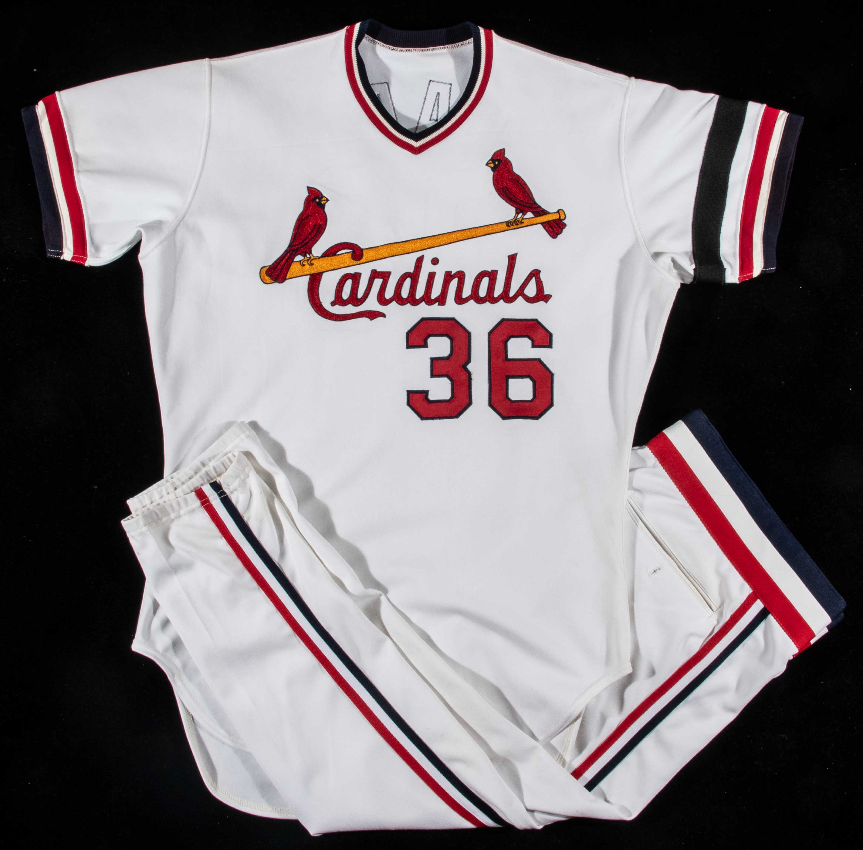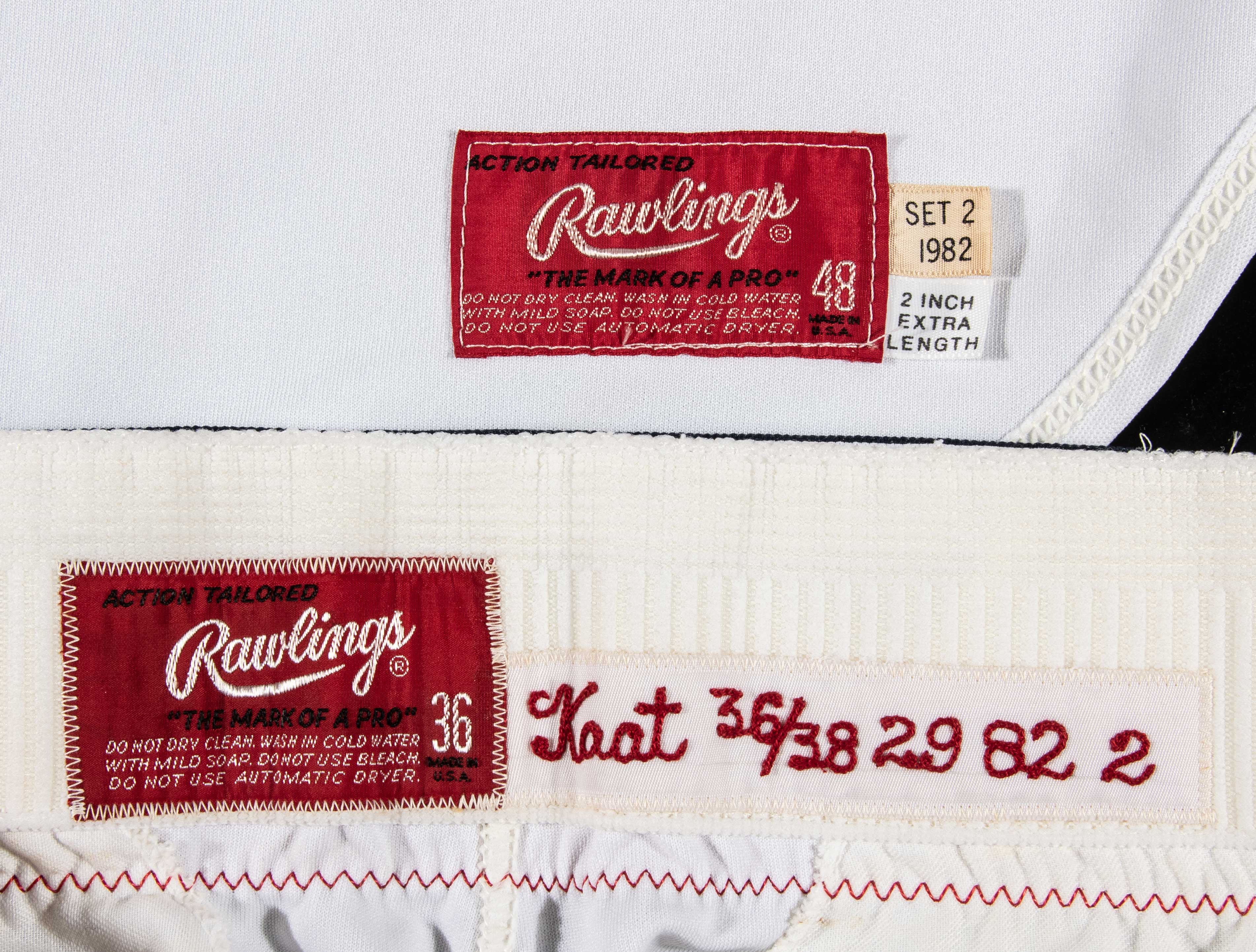 Description:1982 Jim Kaat autographed St. Louis Cardinals professional model home uniform inscribed "WS game worn." White home jersey has the "Cardinals" logo embroidered on front with number "36" below. The number also appears on back below "Kaat" name. On the left sleeve is a black memorial armband worn in honor of Ken Boyer. Rawlings tag on the inside front tail notes size (48) and there are adjacent "Set 2 1982" and "2 Inch Extra Length" flag tags. Signed on the back numbers "Jim Kaat" and inscribed "HOF 2022" and "1982 WS game worn." Silver marker signature rates 8 out of 10. Matching pants are likewise by Rawlings (size 36) with "Kaat 36/38 29 82 2" embroidered strip tag. Nice use and wash wear are evident throughout. Kaat made (4) relief appearances for the Cardinals in the 1982 World Series helping them to the first and only World Series Championship of his Hall of Fame career. Includes LOA from Hunt Auctions, auction LOA from JSA, and signed letter of provenance from Jim Kaat: EX