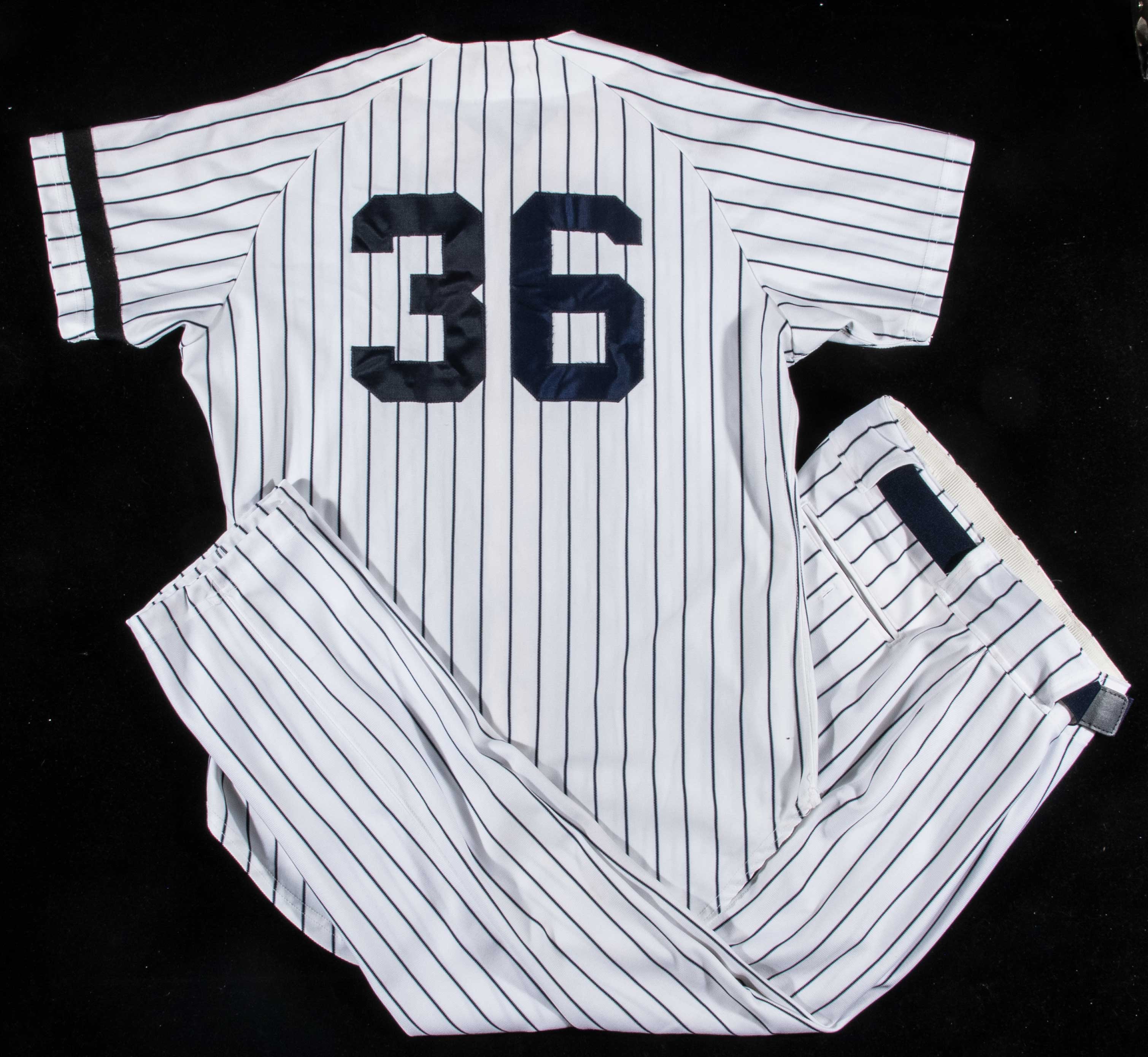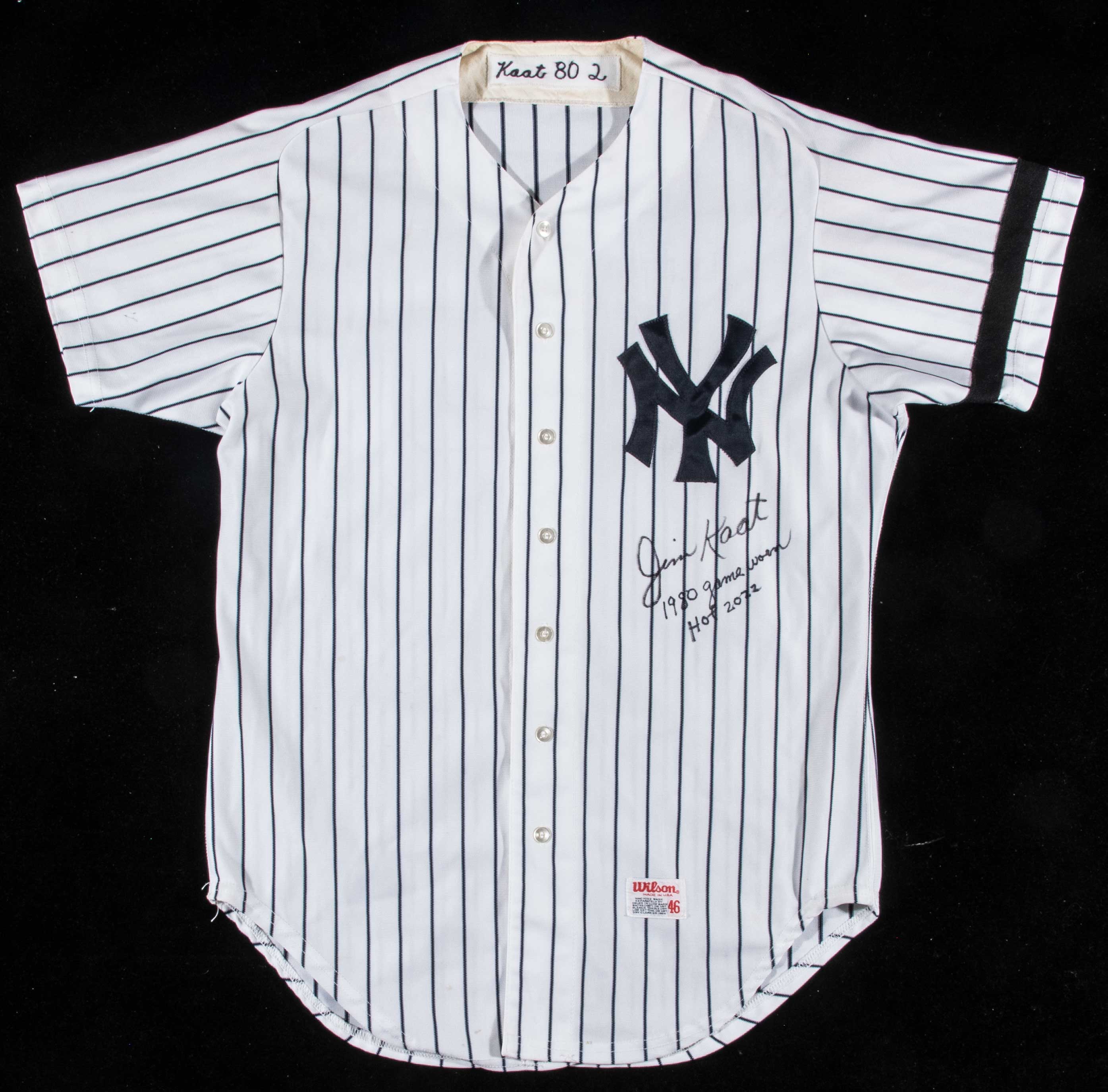 Description:1980 Jim Kaat autographed "game worn" New York Yankees professional model home jersey (Munson armband). Pinstriped jersey has the famed "NY" logo on front and number "36" appears on the back. "Kaat 80 2" embroidered strip tag in the collar denotes player, year, and set number. Wilson tag on the front tail notes size (46). Black armband on the left sleeve is original to the jersey and was worn in honor of the passing of Thurman Munson in 1979. Signed "Jim Kaat" and inscribed "1980 game worn HOF 2022" in marker rating 8 out of 10. Nice use and wash wear are evident throughout. Included for display are a pair of Yankees pants (tagged from 2003 and presumably issued to Kaat for an Old-Timers event) with belt. Kaat's playing days in New York were short lived but he would later go to become a well known broadcaster for the Yankees. Includes LOA from Hunt Auctions, auction LOA from JSA, and signed letter of provenance from Jim Kaat: EX