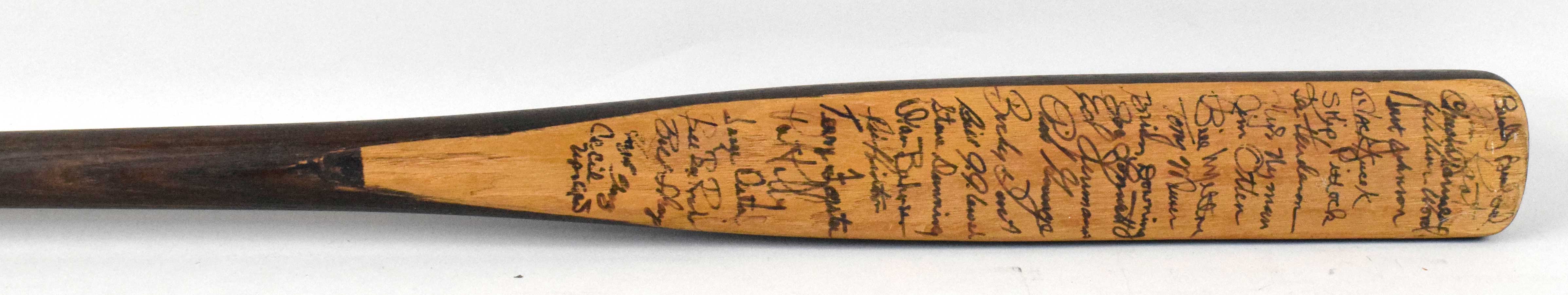 Description:1974 Chicago White Sox team signed baseball bat. Louisville Slugger 125 model R161 Pat Kelly professional model bat shows light use and the back half of the barrel has cracked off. Signed throughout this surface (back half) by (28) including Jim Kaat, Goose Gossage, Chuck Tanner, Wilbur Wood, Bill Melton, Bucky Dent, and others. Marker signatures generally rate 7/8 out of 10 (Kaat slightly lesser). Includes auction LOA from JSA and signed letter of provenance from Jim Kaat: Sigs. VG-EX/MT