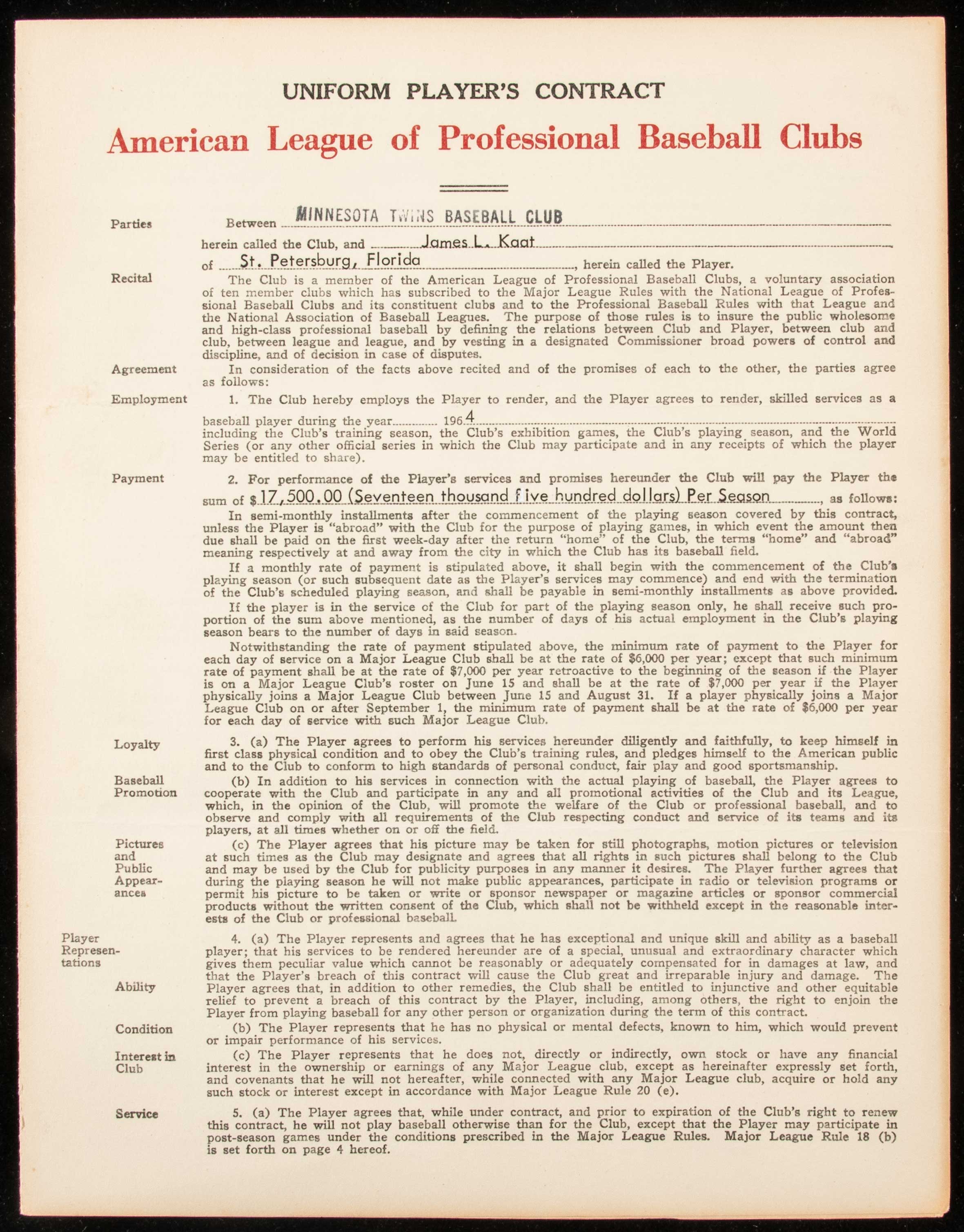 Description:1964 Jim Kaat autographed Minnesota Twins player's contract. Uniform Player's Contract dated November 15, 1963 and executed between Kaat and the Minnesota Twins. Signed "James L Kaat" inside along with Calvin Griffith on behalf of the team. Signatures rate 9 out of 10. Light handling and storage wear. Kaat won (17) games in 1964 earning his third Gold Glove. auction LOA from JSA, and signed letter of provenance from Jim Kaat: Sigs. NM, Contract EX/MT