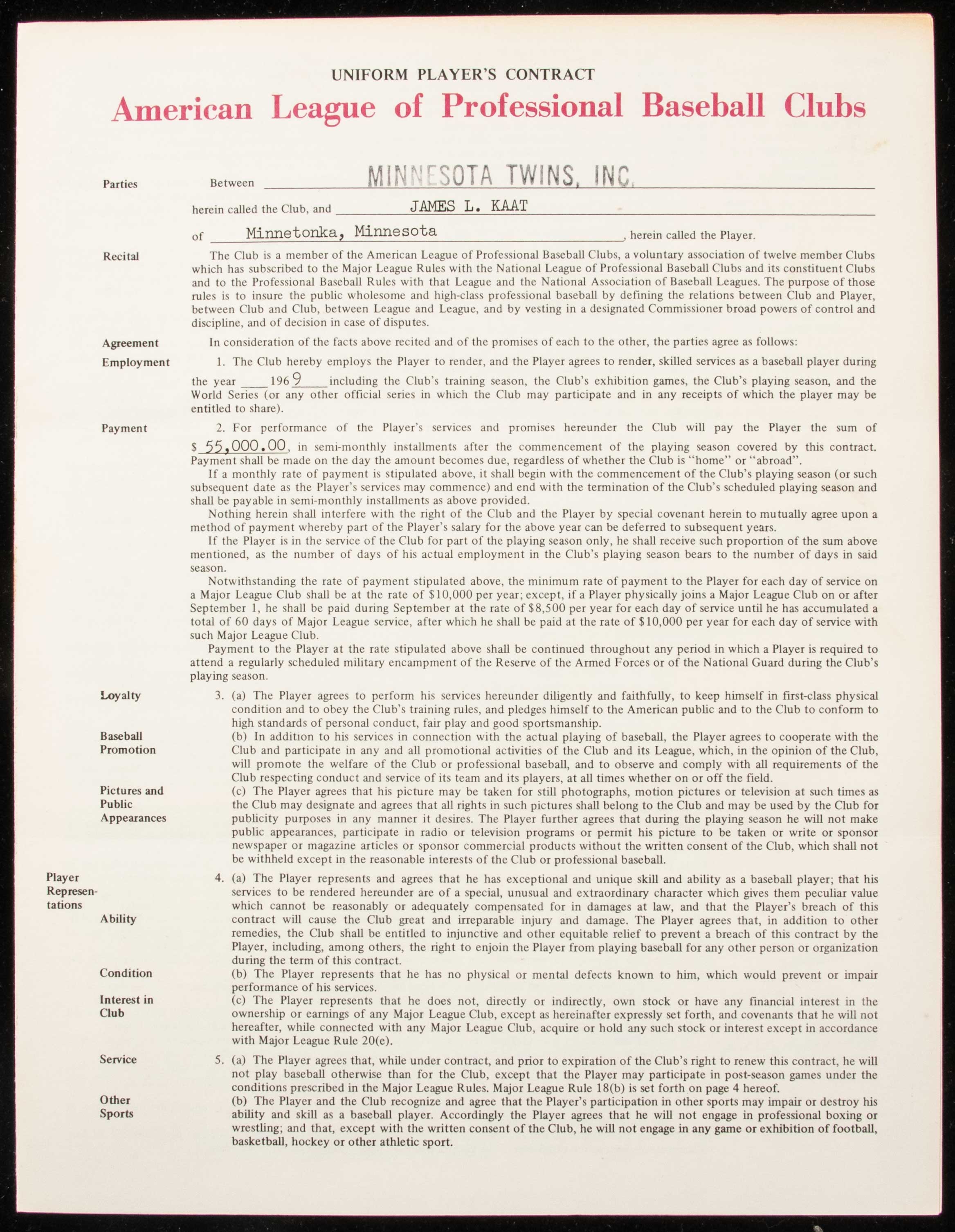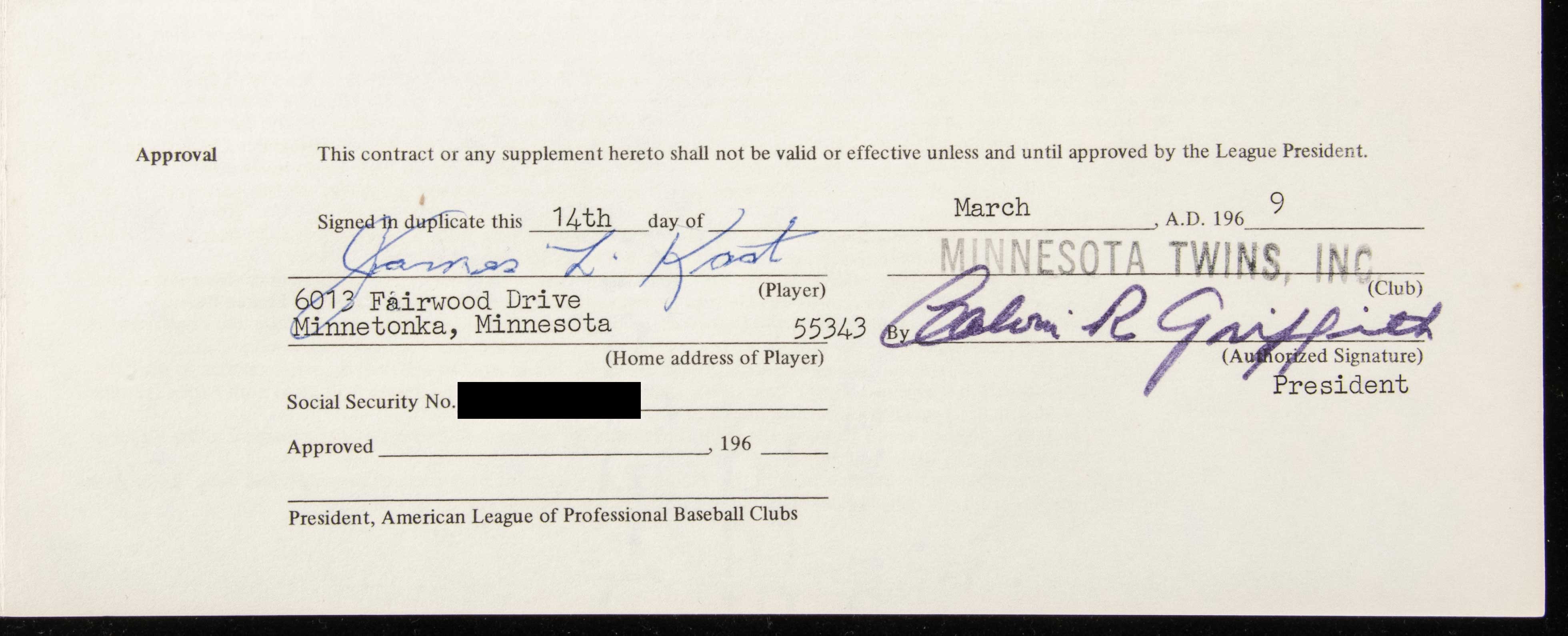 Description:1969 Jim Kaat autographed Minnesota Twins contract. Uniform Player's Contract dated March 14, 1969 and executed between Kaat and the Minnesota Twins. Signed "James L. Kaat" inside along with Calvin Griffith on behalf of the team. Signatures rate 8 to 9 out of 10. Light handling and storage wear. Kaat again posted impressive numbers and earned his eighth consecutive Gold Glove. Includes auction LOA from JSA and signed letter of provenance from Jim Kaat: Sigs. NM, Contract EX
