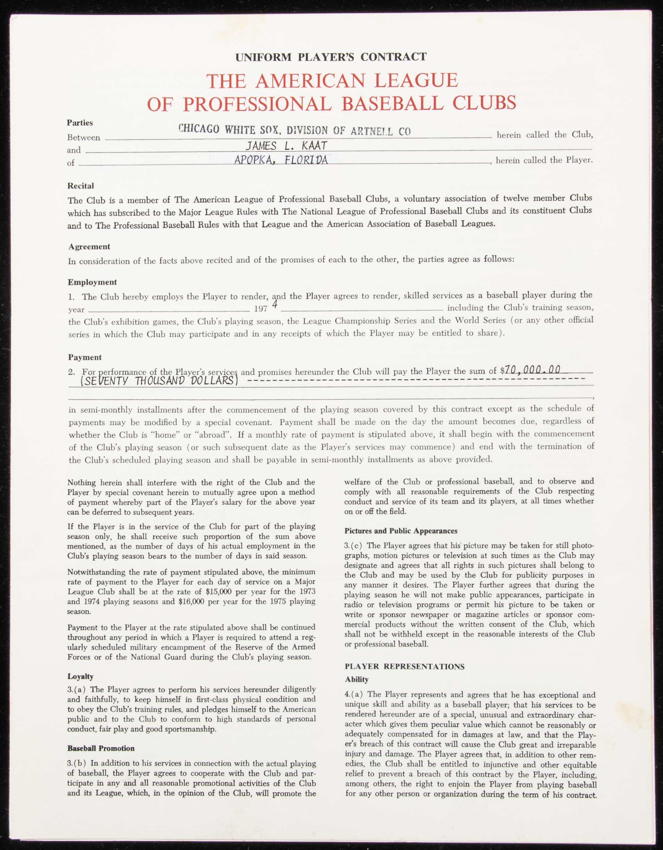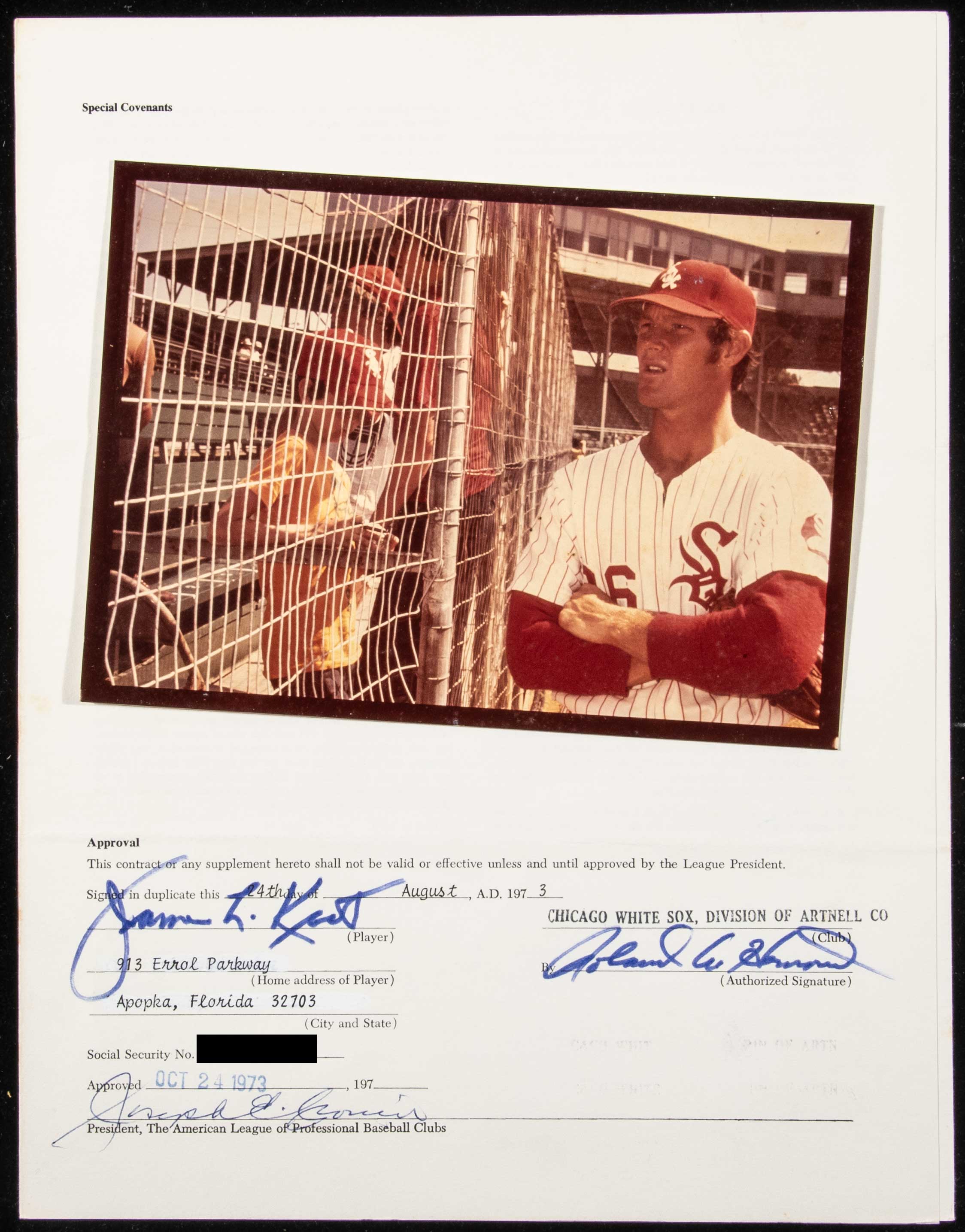 Description:1974 Jim Kaat autographed Chicago White Sox contract. Uniform Player's Contract dated October 24, 1973 and executed between Kaat and the Chicago White Sox. Signed "James L Kaat" inside along with a team representative. American League President Joe Cronin has also signed. Signatures rate 8 to 9 out of 10. Light handling and storage wear. Kaat won (21) games in his first season with the White Sox and earned his thirteenth Gold Glove. Includes vintage photo of Kaat for display, auction LOA from JSA, and signed letter of provenance from Jim Kaat: Sigs. NM, Contract EX