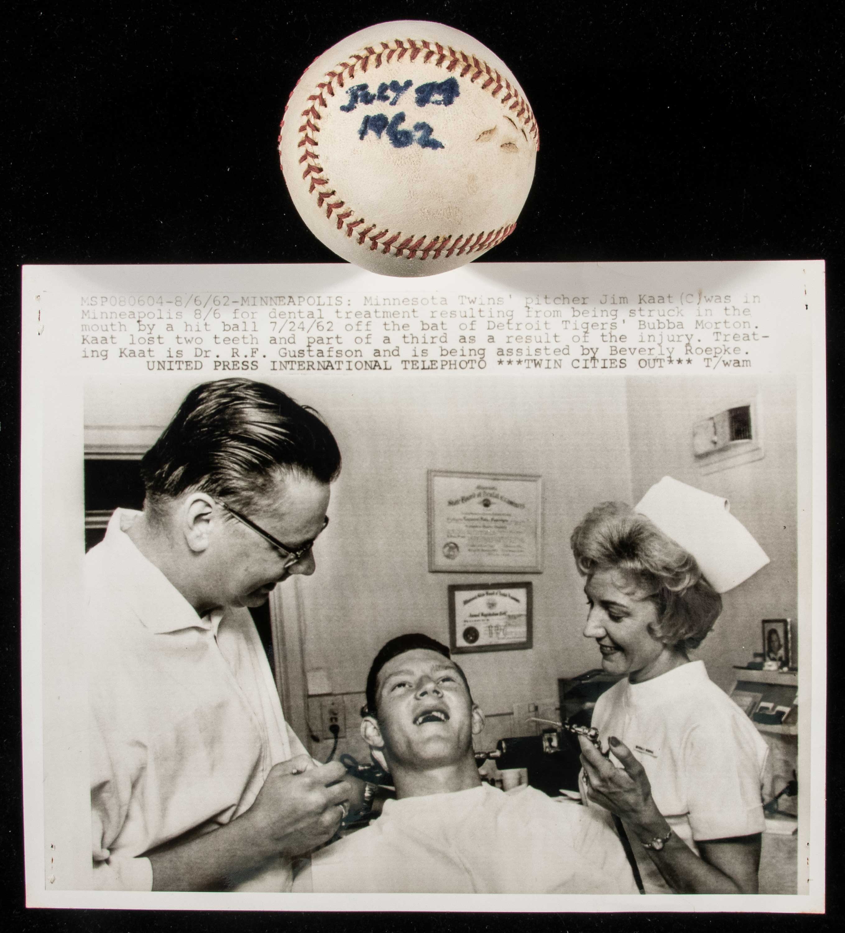 Description:July 24, 1962 Jim Kaat attributed thrown baseball - hit back to knock out his teeth. Worn and used baseball (no visible stampings) which has an old marker notation on the side which reads "July 24, 1962." To the right are a series of small divots in the leather surface which Jim Kaat has attested are teeth marks. An included 8"x10" photograph (vintage telephoto with caption printed in) shows him seated in a dentists' chair undergoing treatment after being hit in the mouth by a pitch which was hit by Bubba Morton of the Tigers. It struck Kaat in the mouth. He lost two teeth as a result and chipped a third. One of the more interesting curiosities we have offered and a conversation piece to say the least. Includes aforementioned photo and signed letter of provenance from Jim Kaat: EX