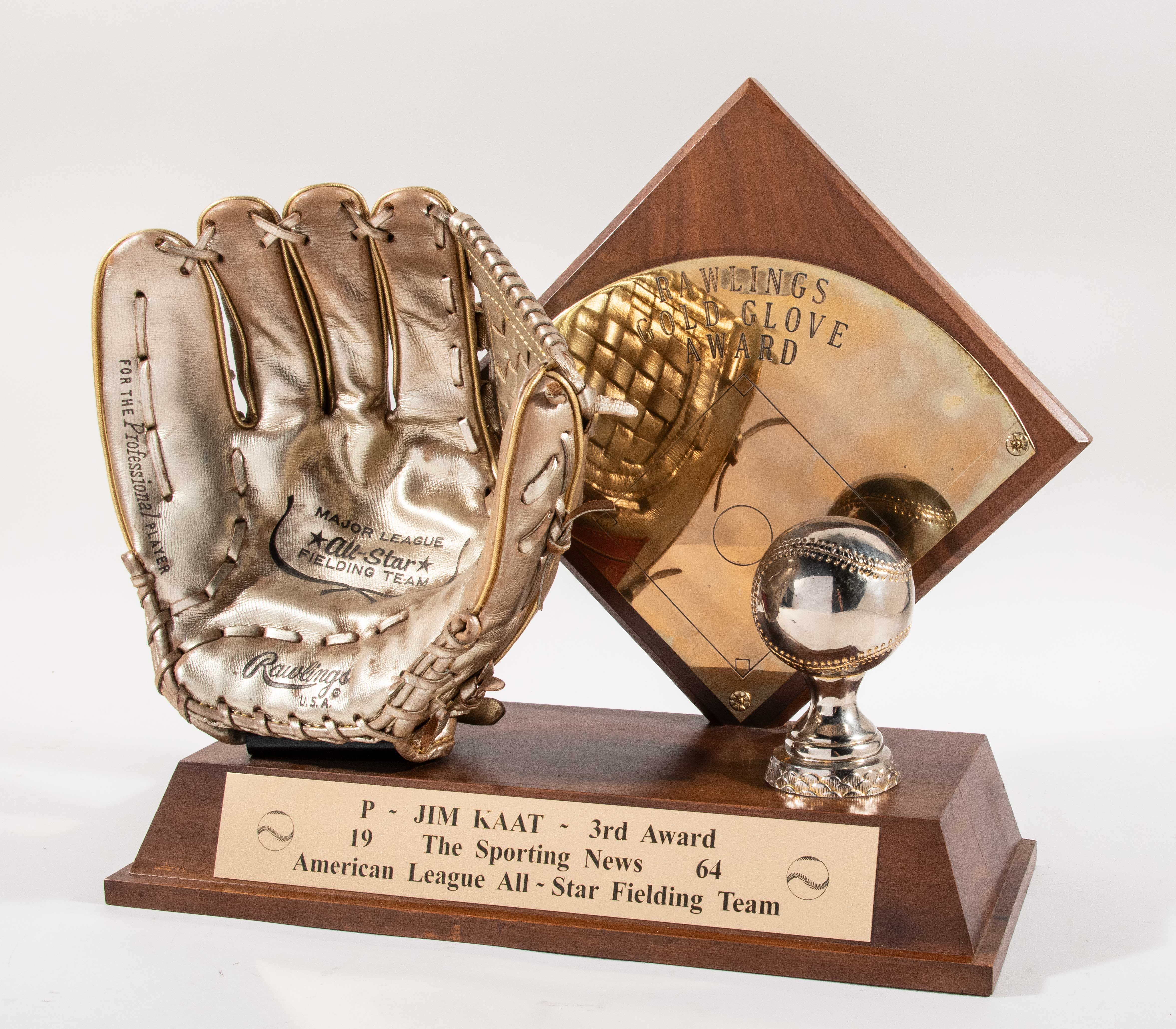 Description:1964 Jim Kaat Gold Glove Award. Prestigious figural award as presented annually to the premier defensive players of the National and American League by position. Walnut wooden plinth base displays a full size gilt painted Rawlings leather glove with "Major League All Star Fielding Team" text. Figural baseball shaped finial is affixed in front of diamond shaped wooden back splash with brass facade having "Rawlings Gold Glove Award" inscribed on front. Brass placard on the base front reads, "P - Jim Kaat - 3rd Award, 1964 The Sporting News American League All-Star Fielding Team". Displays very nicely with the brass plate on lower front being a modern replacement and the glove support was likewise redone. Kaat won (17) games for the Minnesota Twins in 1964 and the following season would help lead the team to the American League title. Includes signed letter of provenance from Jim Kaat: EX with note to description