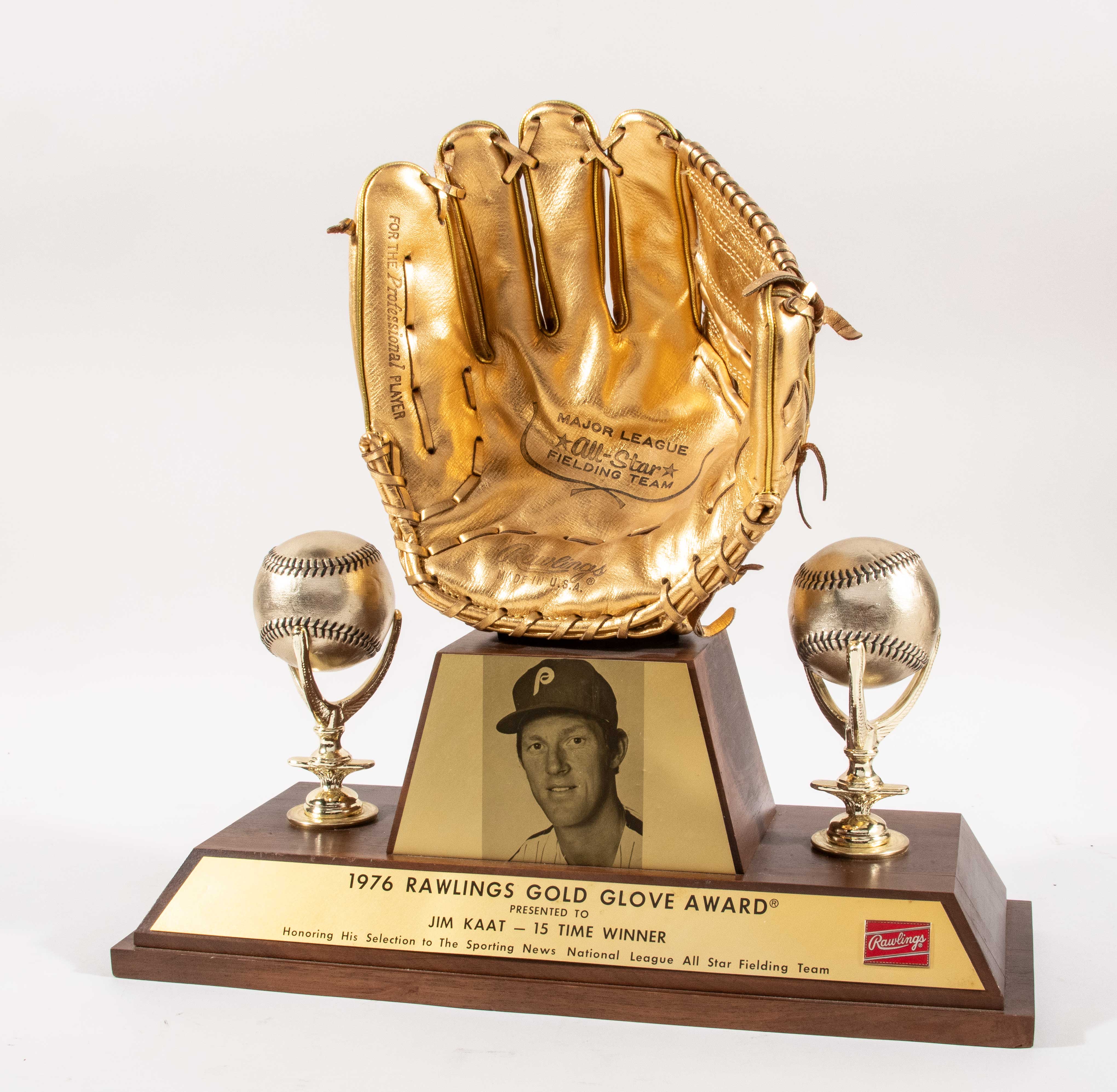 Description:1976 Jim Kaat Gold Glove Award. Prestigious figural award as presented annually to the premier defensive players of the National and American League by position. Wooden base has a platform affixed which supports a full size gilt painted Rawlings leather glove with "Major League All Star Fielding Team" text. A pair of ornate holders on either side hold baseballs which have likewise been finished in gold. Affixed to the lower front is a brass placard reading, "1976 Rawlings Gold Glove Award Presented to Jim Kaat - 15 Time Winner, Honoring His Selection to The Sporting News National League All Star Fielding Team". Mounted just above is an additional plaque with a portrait of Kaat. Displays very nicely however there has been some restoration and replacement of the baseball holders and glove support. A desirable award related to a Hall of Fame career. Includes signed letter of provenance from Jim Kaat: EX with note to description
