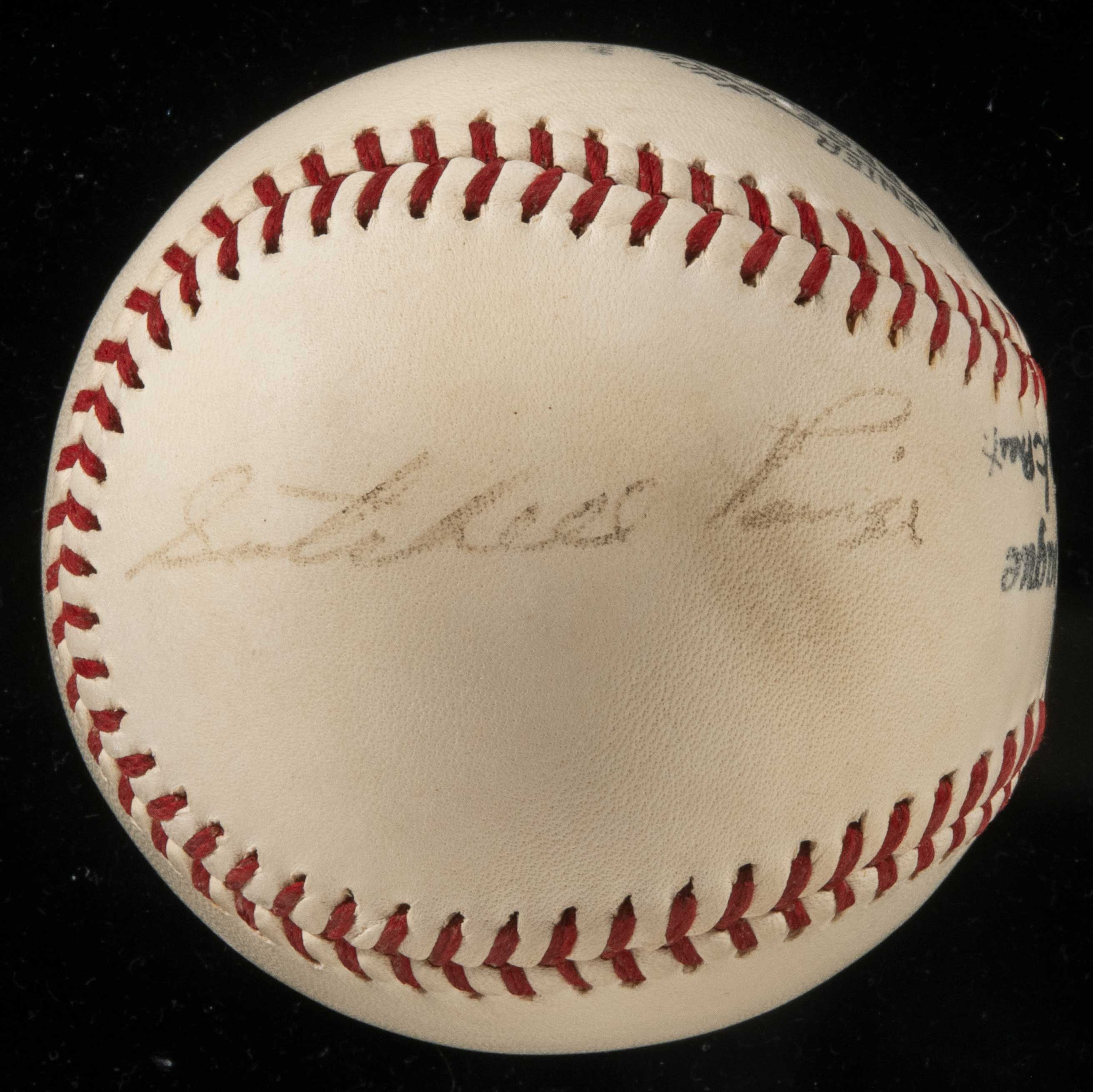 Description:Rare playing career era Satchel Paige single signed baseball c.1930-40s. Spalding official F.Frick NL ball signed by Paige in black fountain pen. Signature rates 6/7 out of 10. Clean ball with very bold stampings, and just a small area of discoloration to the bottom right of the autograph. This example dates to the prime of Paige’s Negro League playing career and is consistent with numerous documented examples including Kansas City Monarchs baseballs of the period. Notable rarity and only the second such example we have encountered. Includes full LOA from JSA: Ball: EX, Signature: EX-MT