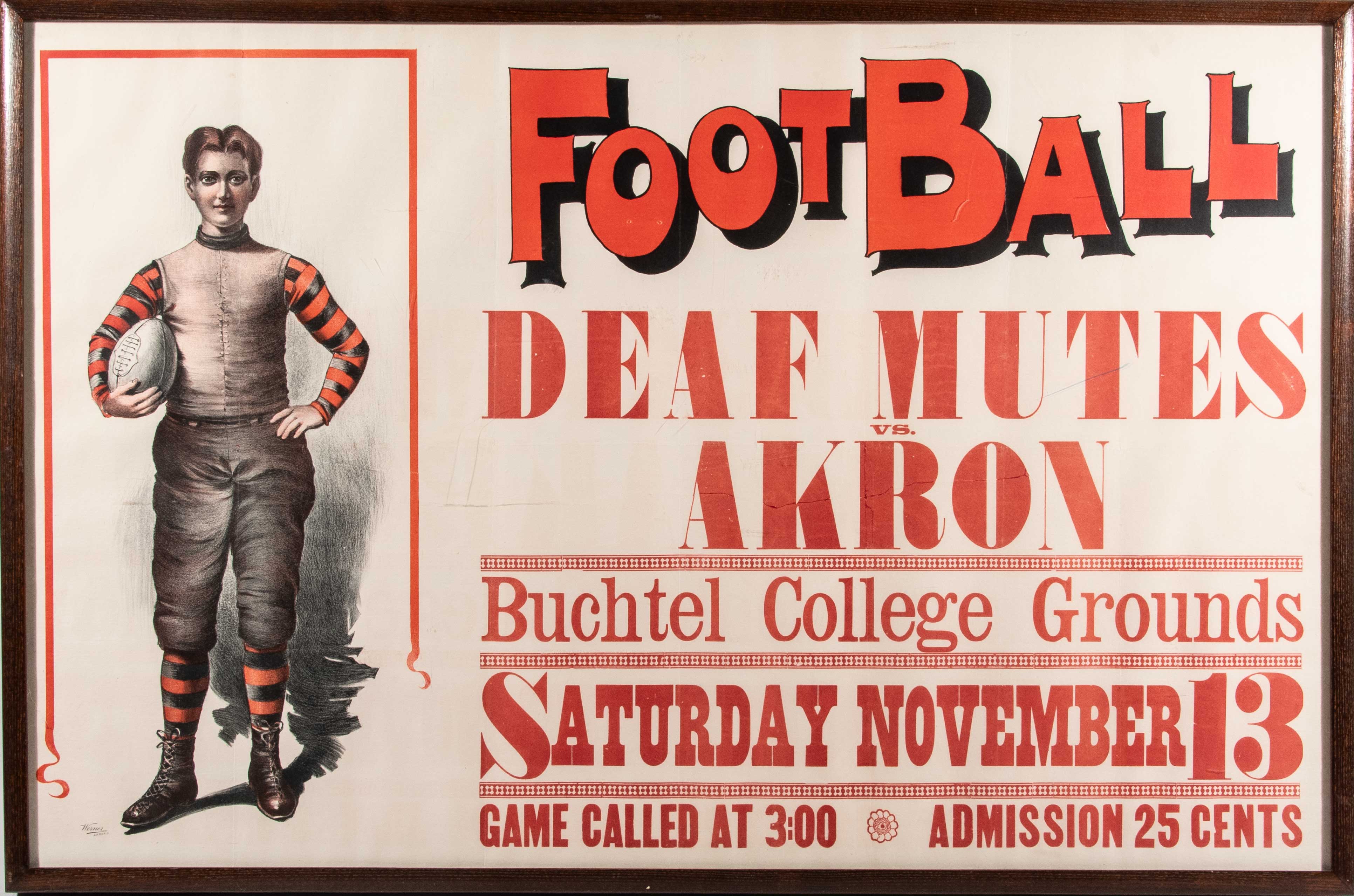 Description:Magnificent Football game advertising broadside c.1897. Striking large format poster done to promote a football game played between an Akron, Ohio team and the "Deaf Mutes." Housed in a 26"x40" frame and displays at the EX-EX/MT level however there are some light visible fold lines and several small areas of inpainting and/or other restoration. It is believed that the game itself was played on November 13, 1897 and printouts of an newspaper article published (2) days later are included. Among the very best of an extremely small surviving population of early football related advertising piece of this caliber: Displays EX-EX/MT with note to restoration