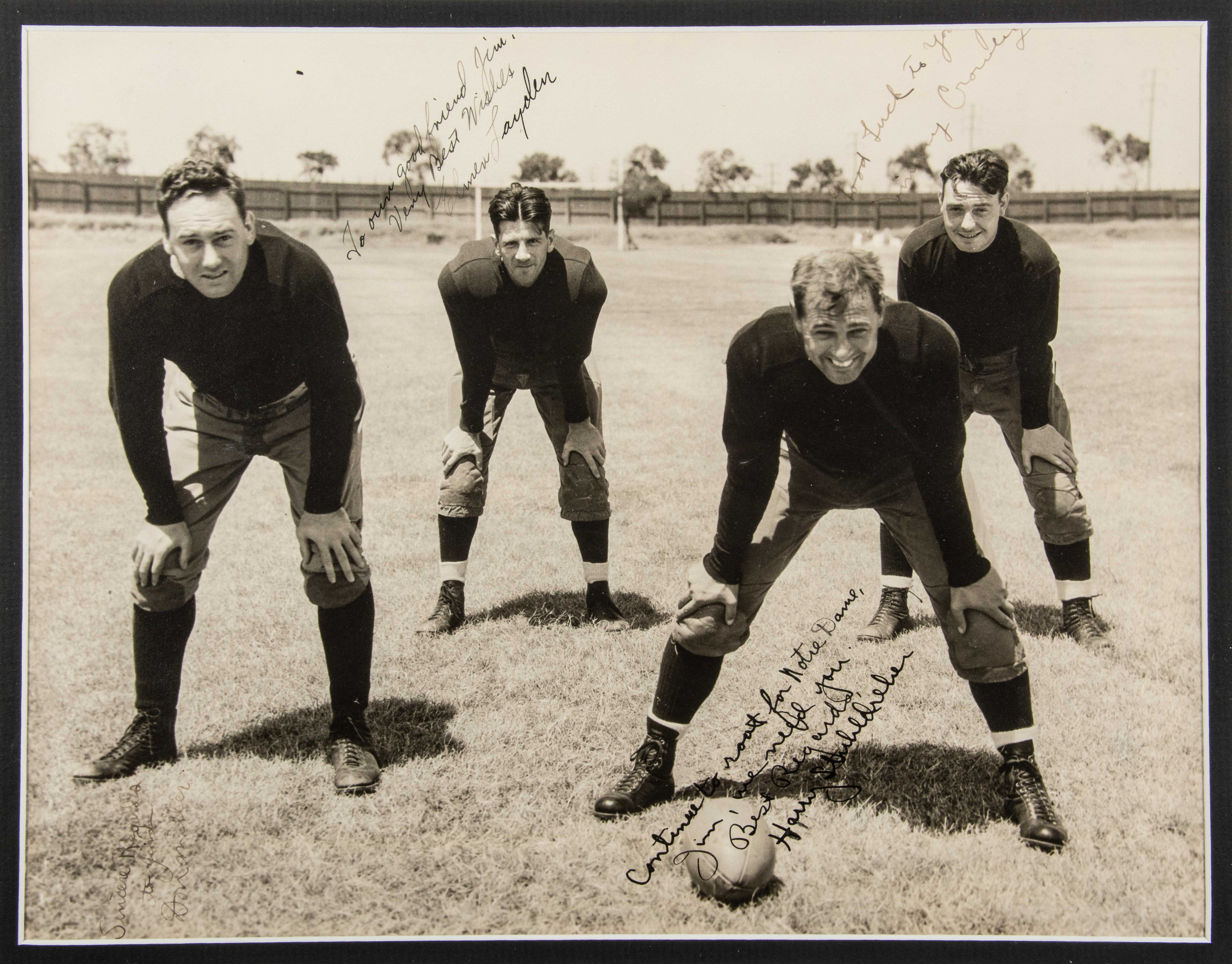Description:Outstanding "Four Horsemen of Notre Dame" multi-signed photograph (PSA/DNA full LOA). Approx. 17.5"x20.5" frame containing a striking 10.5"x13.5" (visible) photo signed by Jimmy Crowley, Elmer Layden, Don Miller, and Harry Stuhldreher in vintage black fountain pen. Signatures rate: Stuhldreher (9/10 out of 10), Layden (7 out of 10), Crowley (7 out of 10), and Miller (6 out of 10). LOA from PSA/DNA notes that the autographs are inscribed to James Christensen who taught at Notre Dame in the period. Includes the referenced LOA from PSA/DNA: NM