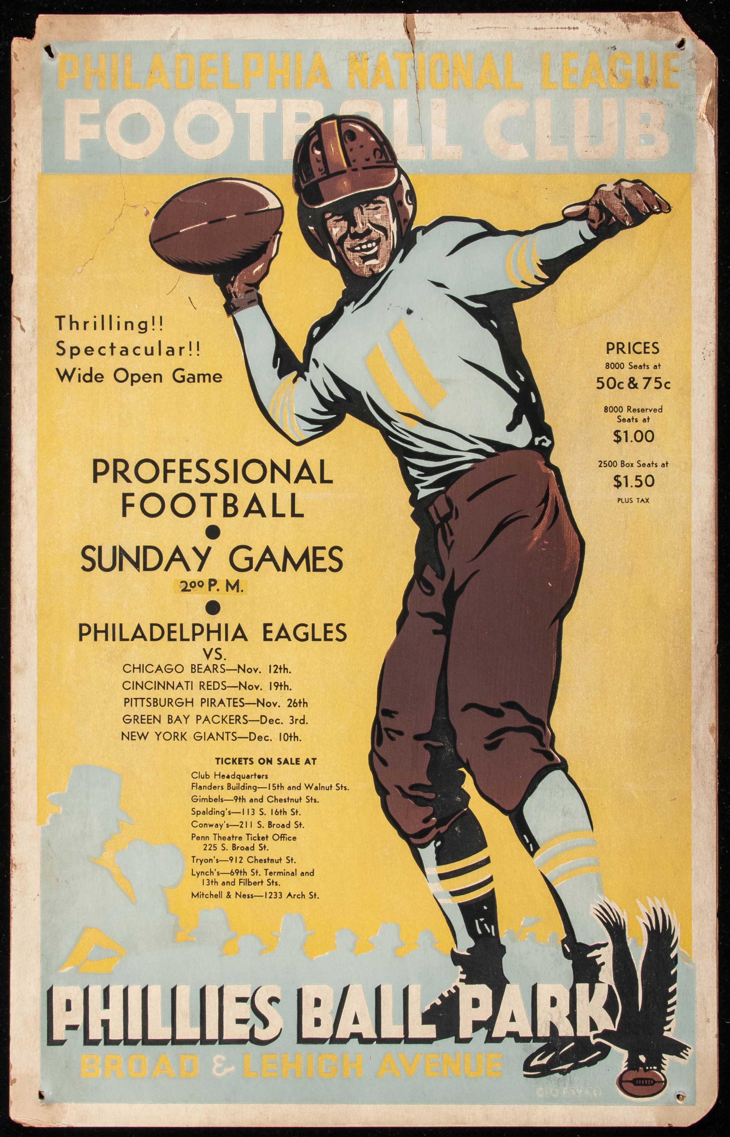Description:Spectacular 1933 Philadelphia Eagles advertising broadside (1st year in National Football League). Exceptionally rare 14"x22" promotional piece done on heavy stock with a large player graphic and "Philadelphia National League Football Club" titling. Text below relays their schedule starting around half way through the season with the Chicago Bears noted as the November 12th opponent. The Cincinnati Reds and Pittsburgh Pirates game dates are reversed but the Packers and Giants games which finished out the season align properly with their 1933 schedule. It would mark the Eagles first season in the NFL, with the franchise growing to one of the largest and most dedicated fan bases in all of professional sports. Various flaws with the most notable being some nail/tack holes, chipping to corners, some creasing to upper left, and a larger tear/break extending from the top edge down through the sky blue colored text block. It retains exceptional display value, and is certainly among the premier early Eagles related display pieces that we have seen. Rarity can not be overstated: FR/GD