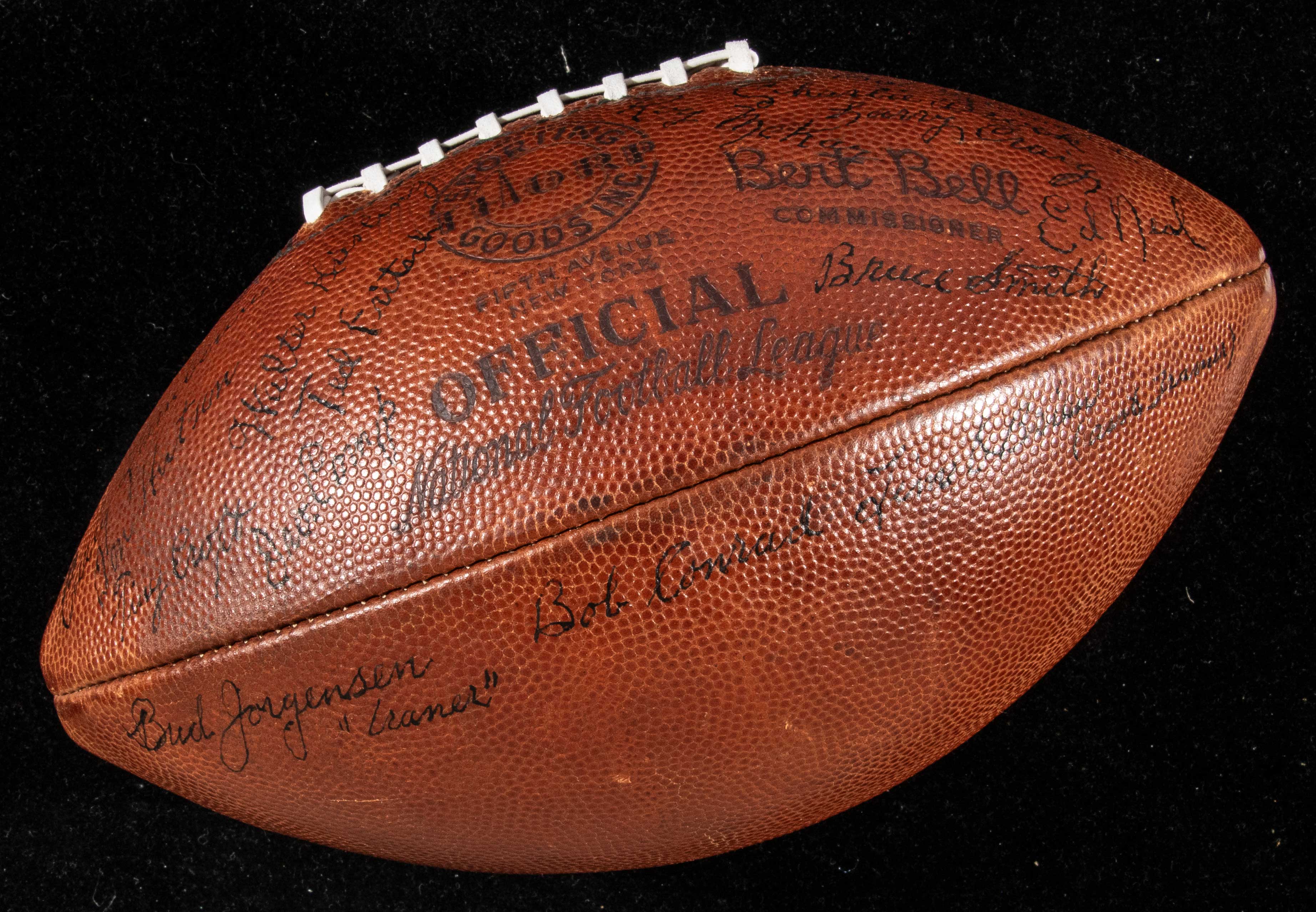 Description:High grade 1946 Green Bay Packers team signed football with Lambeau, Hutson, Canadeo, Smith. Thorp Sporting Goods official NFL Bert Bell football signed by (38) members of the 1946 Packers including Curly Lambeau, Don Hutson, Walt Kiesling, Tony Canadeo, Bruce Smith, Ted Fritsch, Herm Rohrig, Irv Comp, Bob Nussbaumer, Bob Forte, Larry Craig, Walt Schlinkman, Clyde Goodnight, Don Wells, Paul Lipscomb, Bob Flowers, Les Gatewood, Nolan Luhn, Roy McKay, Charlie Brock, Bill Lee, and others. Signatures rate 6/7 to 9 (avg 8) out of 10. Rebladdered with new laces, but minimal wear (does have light "46" rubbed/written on a lower panel, and "47" beside the laces). Includes full LOAs from both JSA and PSA/DNA: EX/MT-NM