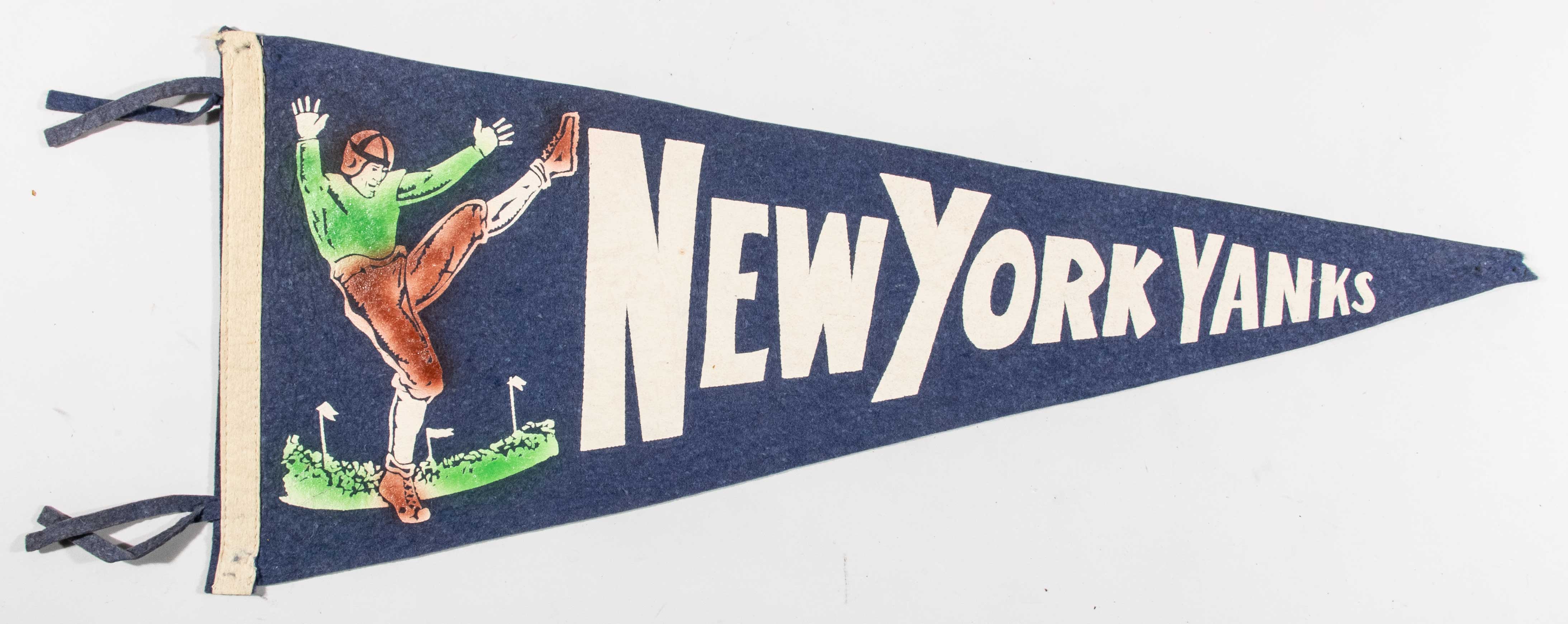 Very rare New York Yanks vintage pennant c.1946-48. 27" blue pennant with white lettering and vibrant player graphic. Tack holes, and fabric loss at the tip, but minimal wear to the interior portion of the pennant: VG