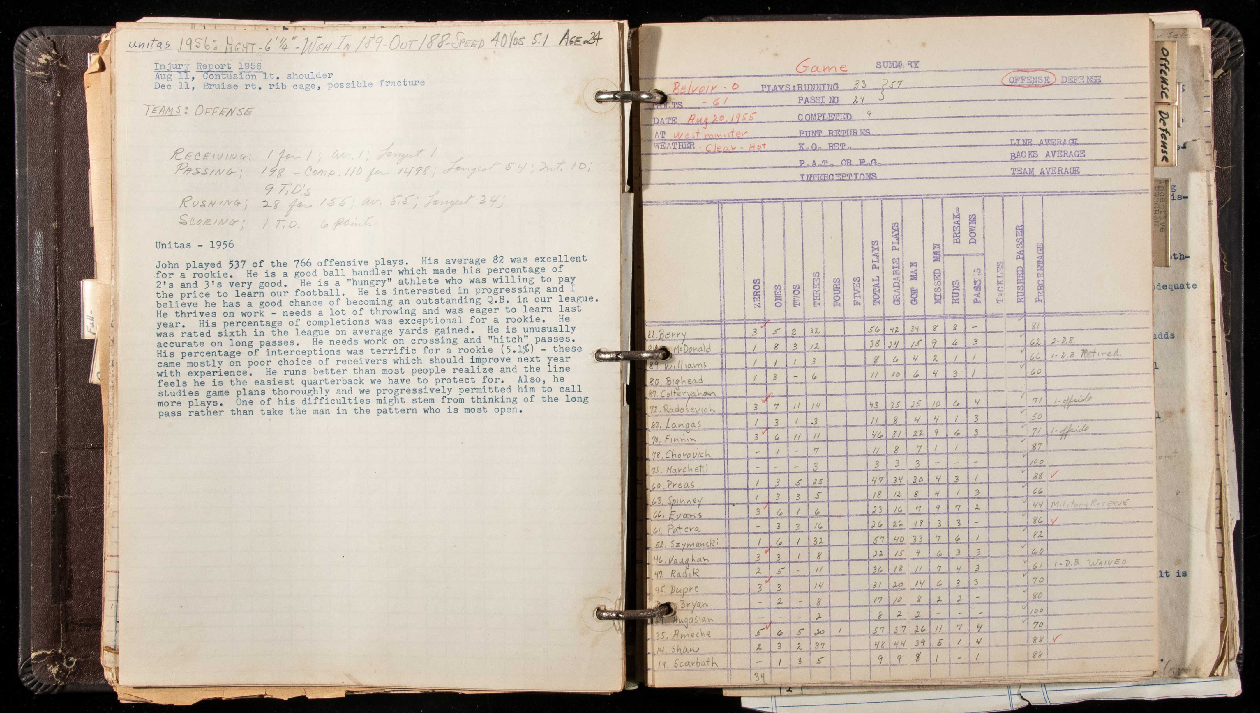 Description:Significant 1954-56 Weeb Ewbank attributed Baltimore Colts personnel binder including rookie Unitas. Approx. 2" thick binder with vintage "Personnel Statistics 1955-55" label taped on the cover, but also contains 1956 info as well. Although his name is not shown, we can be very confident attributing it to Ewbank based on the content and handwriting. It appears Ewbank was ahead of his time in player evaluations by creating a grading scale which rated each player on every gradable play. Evaluations are broken down by position and include grades for each game of a player's season from 1954-1956, along with measurables including 40-times, as well as injury reports, stats, and Ewbank's player summaries. Contains pages for virtually each player from those seasons including rookie Johnny Unitas, Raymond Berry, Gino Marchetti, Art Donovan, Lenny Moore, Don Shula, Alan Ameche, etc. Within the lengthy Unitas comments, it mentions "He is interested in progressing and I believe he has a good chance of becoming an outstanding Q.B. in our league" (and goes on to mention other qualities). Normal age/handling wear: EX