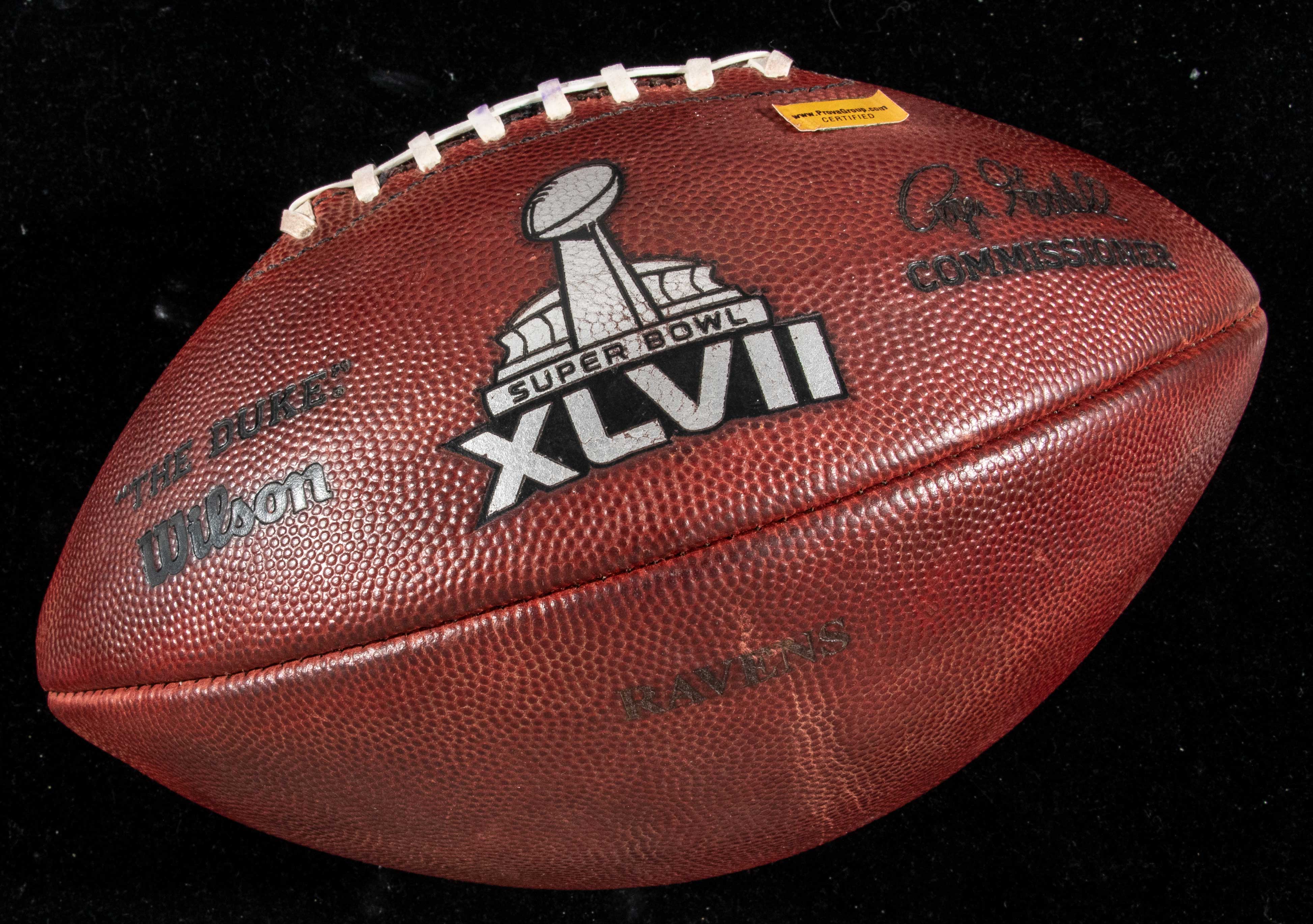 Description:Super Bowl XLVII game used football (Ravens defeat 49ers). Wilson NFL official Super Bowl XLVII game ball used by the Baltimore Ravens on offense with "RAVENS" branded on the lower panel. Visible use with scattered surface wear and scuff marks. Includes NFL Auction COA from PSA, with matching serial #2N90733 sticker on the ball: EX